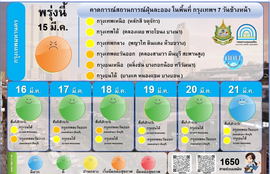 วันที่ 16 มี.ค. 2566 เป็นต้นไปสถานการณ์ในพื้นที่กรุงเทพมหานครและปริมณฑลมีแนวโน้มที่ดีขึ้นเป็นลำดับ เนื่องจากลมทางใต้ช่วยพัดพาฝุ่นละอองออกจากพื้นที่ อย่างไรก็ตามช่วงระหว่างวันที่ 14-15 มี.ค. 2566 เป็นช่วงที่ควรเฝ้าระวังของพื้นที่เนื่องจากมีแนวโน้มที่จะได้รับผลกระทบจากฝุ่นละอองข้ามพื้นที่ได้‼️‼️