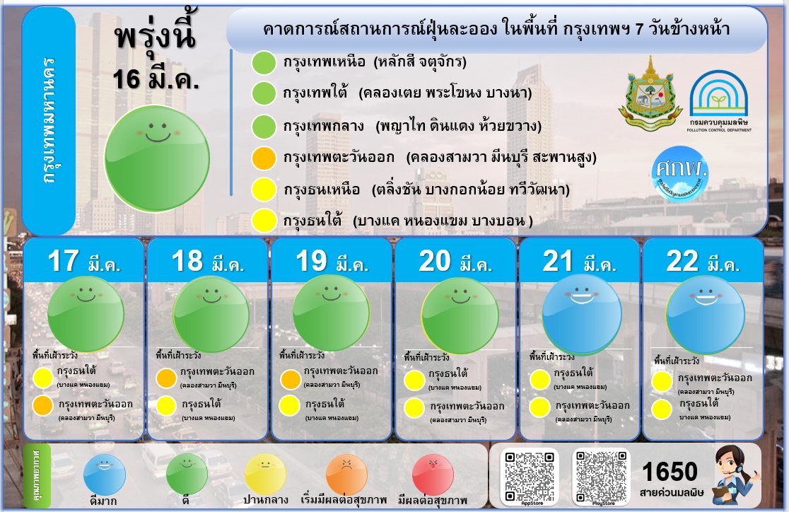 ช่วงวันที่ 16 มี.ค.2566 เป็นต้นไปสถานการณ์ในพื้นที่กรุงเทพมหานครและปริมณฑลมีแนวโน้มที่ดีขึ้นเป็นลำดับ เนื่องจากลมทางใต้ช่วยพัดพาฝุ่นละอองออกจากพื้นที่‼️‼️