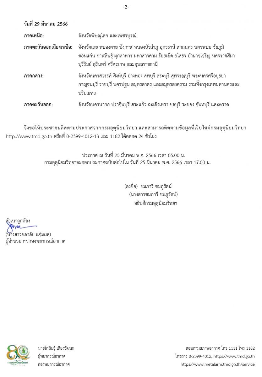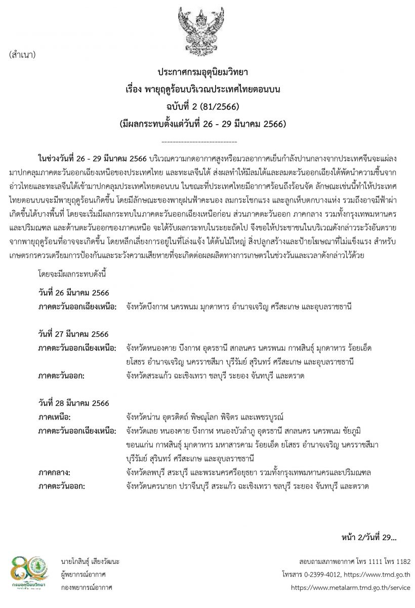 นายอนุชา บูรพชัยศรี รองเลขาธิการนายกรัฐมนตรีฝ่ายการเมือง ปฏิบัติหน้าที่โฆษกประจำสำนักนายกรัฐมนตรีกล่าวว่ากรมอุตุนิยมวิทยา ได้มีการประกาศเตือนในช่วงวันที่ 26 - 29 มีนาคม 2566 ซึ่งบริเวณความกดอากาศสูงหรือมวลอากาศเย็นกำลังปานกลางจากประเทศจีนจะแผ่ลงมาปกคลุมภาคตะวันออกเฉียงเหนือของประเทศไทย และทะเลจีนใต้ ส่งผลทำให้มีลมใต้และลมตะวันออกเฉียงใต้พัดนำความชื้นจากอ่าวไทยและทะเลจีนใต้เข้ามาปกคลุมประเทศไทยตอนบน ในขณะที่ประเทศไทยมีอากาศร้อนถึงร้อนจัด ลักษณะเช่นนี้ทำให้ประเทศไทยตอนบนจะมีพายุฤดูร้อนเกิดขึ้น โดยมีลักษณะของพายุฝนฟ้าคะนอง ลมกระโชกแรง และลูกเห็บตกบางแห่ง รวมถึงอาจมีฟ้าผ่าเกิดขึ้นได้บ้างพื้นที่ โดยจะเริ่มมีผลกระทบในภาคตะวันออกเฉียงเหนือก่อน ส่วนภาคตะวันออก ภาคกลาง รวมทั้งกรุงเทพมหานครและปริมณฑล และด้านตะวันออกของภาคเหนือ จะได้รับผลกระทบในระยะถัดไป จึงขอให้ประชาชนในบริเวณดังกล่าวระวังอันตรายจากพายุฤดูร้อนที่อาจจะเกิดขึ้น โดยหลีกเลี่ยงการอยู่ในที่โล่งแจ้ง ใต้ต้นไม้ใหญ่ สิ่งปลูกสร้างและป้ายโฆษณาที่ไม่แข็งแรง สำหรับเกษตรกรควรเตรียมการป้องกันและระวังความเสียหายที่จะเกิดต่อผลผลิตทางการเกษตรในช่วงวันและเวลาดังกล่าวไว้ด้วย โดยจะมีผลกระทบดังนี้