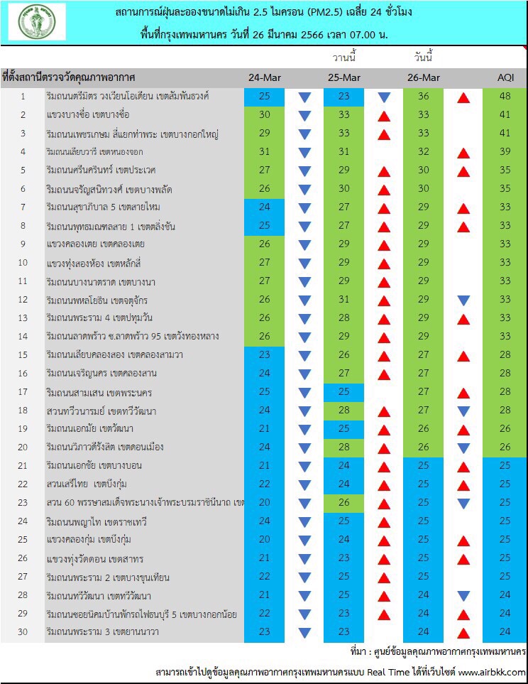 กรุงเทพฯ-ศูนย์ข้อมูลคุณภาพอากาศกรุงเทพมหานครสรุปผลการตรวจวัด PM2.5 วันที่ 26 มี.ค.2566 เวลา 05.00-07.00 น. (3 ชั่วโมงล่าสุด)ตรวจวัดได้ 16-36 มคก./ลบ.ม.ค่าเฉลี่ยของกรุงเทพมหานคร 23.9 มคก./ลบ.ม. ฝุ่น PM2.5 ไม่เกินค่ามาตรฐานทุกพื้นที่ที่มีการตรวจวัด ค่า PM2.5 มีแนวโน้มเพิ่มขึ้นและอยู่ในเกณฑ์มาตรฐานทุกสถานีที่มีการตรวจวัด