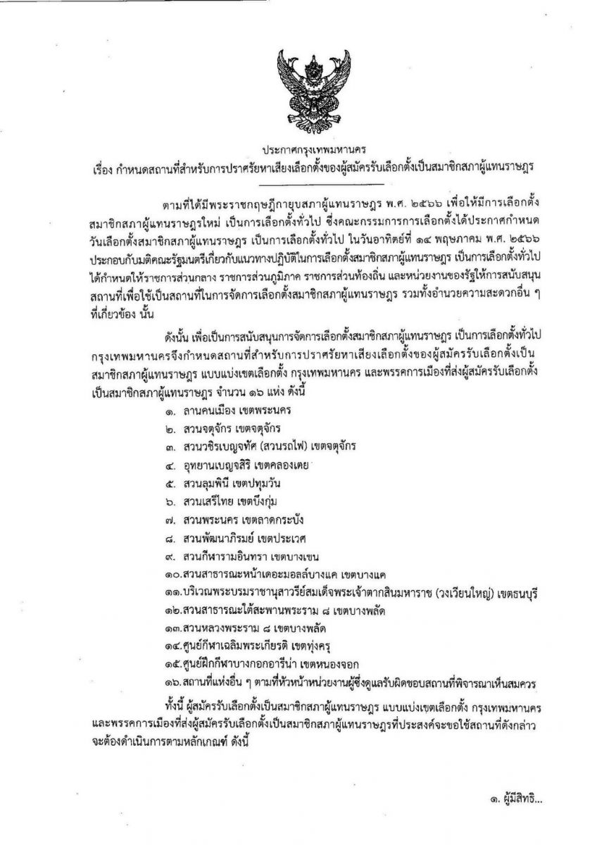 กรุงเทพฯ-กทมกำหนดสถานที่สำหรับการปราศรัยหาเสียงเลือกตั้งของผู้สมัครรับเลือกตั้งเป็นสมาชิกสภาผู้แทนราษฎร แบบแบ่งเขตเลือกตั้ง กรุงเทพมหานคร และพรรคการเมืองที่ส่งผู้สมัครเป็นสมาชิกสภาผู้แทนราษฎร จำนวน 16 แห่ง เพื่อเป็นการสนับสนุนการจัดการเลือกตั้งสมาชิกสภาผู้แทนราษฎร ยื่นขออนุญาตล่วงหน้าอย่างน้อย 3 วัน