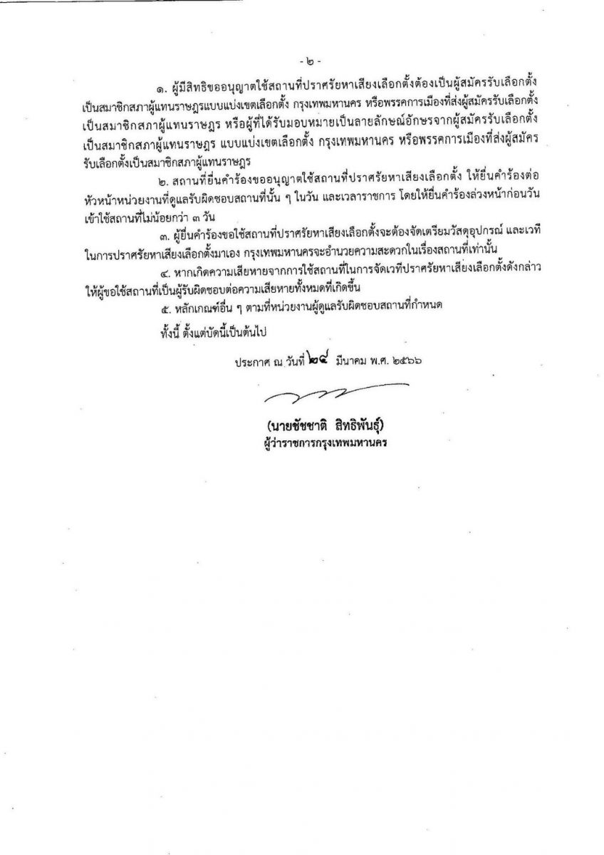 กทม.เปิดสถานที่ให้ผู้สมัครส.ส.ปราศรัย ยื่นขออนุญาตล่วงหน้าอย่างน้อย3วัน