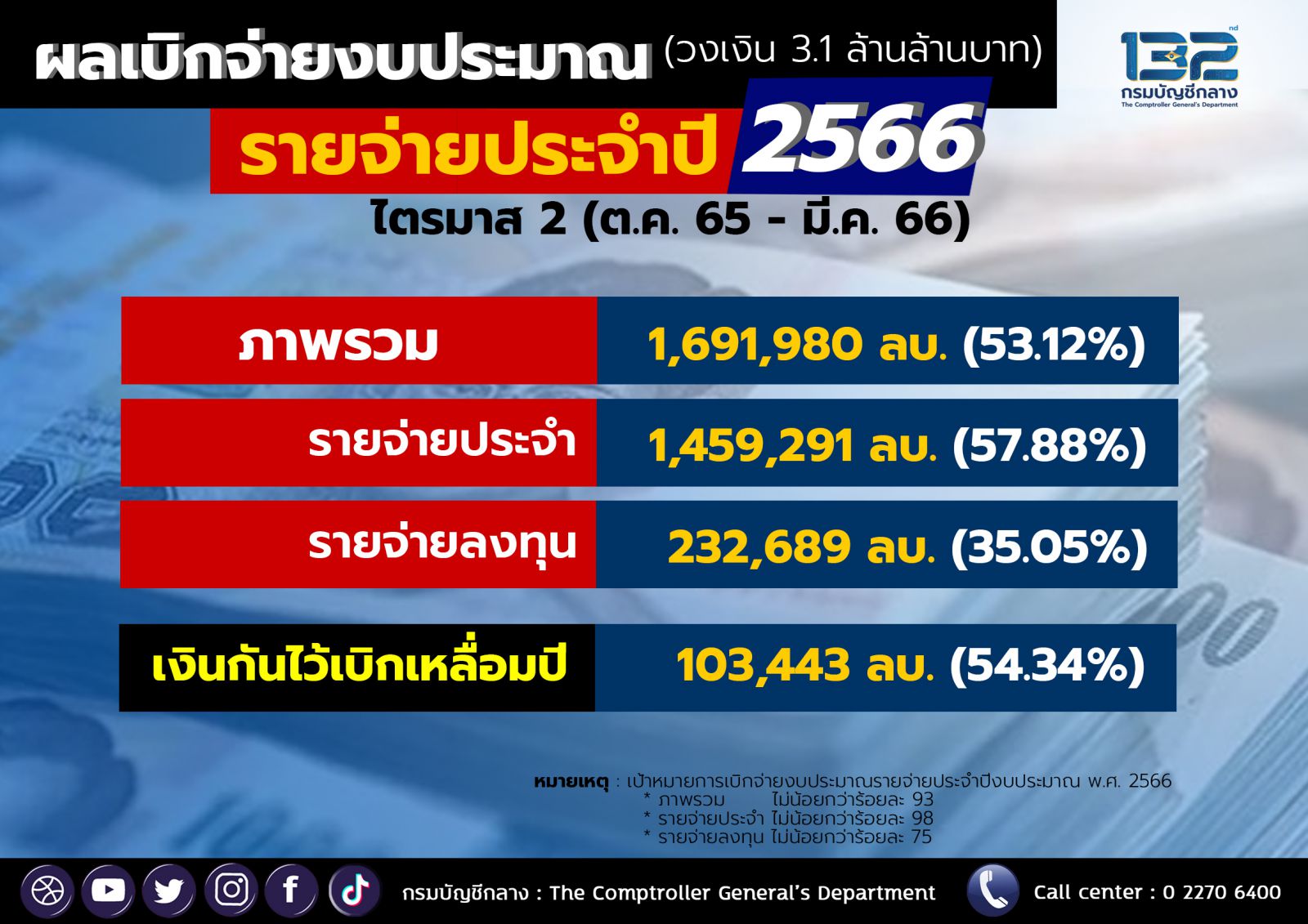 “สำหรับผลการเบิกจ่ายเงินงบประมาณรายจ่ายประจำปีงบประมาณ พ.ศ. 2566 ไตรมาสที่ 2 (ต.ค. 65 - มี.ค. 66)ภาพรวมเบิกจ่ายแล้ว 1,691,980 ล้านบาท คิดเป็น 53.12% ของวงเงินงบประมาณ 3,185,000 ล้านบาท จำแนกเป็นรายจ่ายประจำเบิกจ่ายแล้ว 1,459,291 ล้านบาท คิดเป็น 57.88% ของวงเงินงบประมาณ 2,521,215 ล้านบาท รายจ่ายลงทุนเบิกจ่ายแล้ว 232,689 ล้านบาท คิดเป็น 35.05% และมีการใช้จ่ายหรือก่อหนี้แล้ว จำนวน 398,695 ล้านบาท คิดเป็นร้อยละ 60.06 ของวงเงินงบประมาณ 663,785 ล้านบาท สำหรับเงินงบประมาณที่กันไว้เบิกเหลื่อมปีเบิกจ่ายแล้ว 103,443 ล้านบาท คิดเป็น 54.34% ของวงเงินงบประมาณ 190,348 ล้านบาท ซึ่งขณะนี้คณะทำงานเฉพาะกิจในการติดตามเร่งรัดการเบิกจ่ายเงินฯ ทั้งส่วนกลางและส่วนภูมิภาค (สำนักงานคลังจังหวัดทั้ง 76 จังหวัด) ได้กำกับดูแลเร่งรัดการดำเนินการและการเบิกจ่ายของหน่วยรับงบประมาณที่อยู่ในความรับผิดชอบอย่างใกล้ชิด เพื่อให้การเบิกจ่ายและการใช้จ่ายเงินงบประมาณรายจ่ายประจำปีงบประมาณ พ.ศ. 2566 รวมถึงการใช้จ่ายภาครัฐอื่น เป็นไปอย่างมีประสิทธิภาพ สนับสนุนการฟื้นตัวของเศรษฐกิจ ทั้งนี้ กรมบัญชีกลางได้ประชาสัมพันธ์ลำดับผลการเบิกจ่ายและการใช้จ่าเงินงบประมาณรายจ่าย ประจำปีงบประมาณ พ.ศ. 2566 ที่เว็บไซต์กรมบัญชีกลาง www.cgd.go.th หัวข้อ ข้อมูลสถิติ โดยปรับปรุงข้อมูลทุกสัปดาห์เพื่อเป็นข้อมูลประกอบการติดตามเร่งรัดการเบิกจ่ายและการใช้จ่ายเงินงบประมาณของส่วนราชการ รัฐวิสาหกิจ และหน่วยงานอื่นของรัฐ” อธิบดีกรมบัญชีกลาง กล่าว