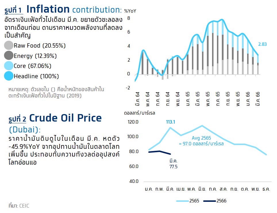 - อัตราเงินเฟ้อทั่วไปเดือน มี.ค. ชะลอลงที่ 2.83%YoY ขยายตัวต่ำสุดในรอบ 15 เดือน จากราคาหมวดพลังงานที่ชะลอลงเป็นสำคัญ ตามราคาน้ำมันเชื้อเพลิงที่ปรับลดลง ขณะที่ราคาหมวดอาหารสดชะลอลงจากราคาเนื้อสัตว์ และกลุ่มไข่และผลิตภัณฑ์นม สำหรับอัตราเงินเฟ้อพื้นฐานขยายตัว 1.75%YoY ชะลอลงตามราคาหมวดอาหารจากผลของฐานในปีก่อนที่ทยอยปรับเพิ่มขึ้น