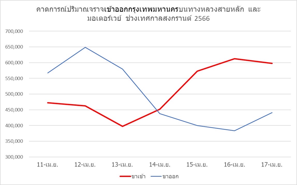 โดยสำนักอำนวยความปลอดภัย ทล. ได้คาดการณ์ปริมาณจราจรเข้าออกกรุงเทพฯ บนทางหลวงสายหลักและมอเตอร์เวย์ 10 เส้นทาง ในช่วงระหว่างวันที่ 11 - 17 เมษายน 2566 รวมทั้งสิ้น 7,026,157 คัน มากกว่าเทศกาลสงกรานต์ปี 2565 อยู่ 5.3% โดยแบ่งเป็นขาออก 3,458,690 คัน และขาเข้า 3,567,467 คัน โดยคาดว่าวันที่ 12 เมษายน 2566 จะมีปริมาณจราจรขาออกสูงสุดประมาณ 648,530 คัน และวันที่ 16 เมษายน 2566 จะมีปริมาณจราจรขาเข้ากรุงเทพฯสูงสุดประมาณ 612,769 คัน ทั้งนี้ เพื่อเป็นการอำนวยความสะดวกแก่ผู้เดินทางและหลีกเลี่ยงปัญหาการจราจรติดขัดในช่วงเทศกาล ทล. ขอแนะนำเส้นทางเลือกบนทางหลวงสายหลักและสายรอง เพื่อให้ประชาชนวางแผนการเดินทางล่วงหน้า โดยแบ่งเป็นภาคต่าง ๆ ดังนี้
