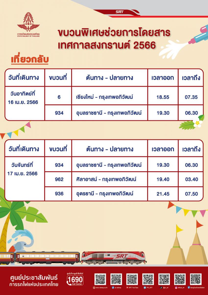 นายเอกรัช ศรีอาระยันพงษ์ ผู้อำนวยการศูนย์ประชาสัมพันธ์ การรถไฟแห่งประเทศไทย (รฟท.) กระทรวงคมนาคม เปิดเผยว่า ตามที่รัฐบาลได้ประกาศให้มีวันหยุดยาวช่วงเทศกาลสงกรานต์ ปี 2566 ทำให้คาดการณ์ว่าในช่วงเทศกาลสงกรานต์ปีนี้จะมีประชาชนและนักท่องเที่ยวใช้บริการเดินทางด้วยรถไฟเป็นจำนวนมาก ในส่วนของขบวนรถที่ให้บริการเป็นประจำตั๋วโดยสารถูกจองเต็มหมดทุกชั้นทุกขบวน ซึ่ง รฟท. ได้เตรียมมาตรการอำนวยความสะดวกรองรับการเดินทางของพี่น้องประชาชนตามนโยบายของนายนิรุฒ มณีพันธ์ ผู้ว่าการรถไฟแห่งประเทศไทย โดยจัดขบวนรถพิเศษช่วยการโดยสาร จำนวน 10 ขบวน ในเส้นทางสายเหนือ 5 ขบวน และสายตะวันออกเฉียงเหนือ 5 ขบวน สามารถรองรับผู้โดยสารได้เพิ่มประมาณ 8,000 คน/วัน ประกอบด้วย