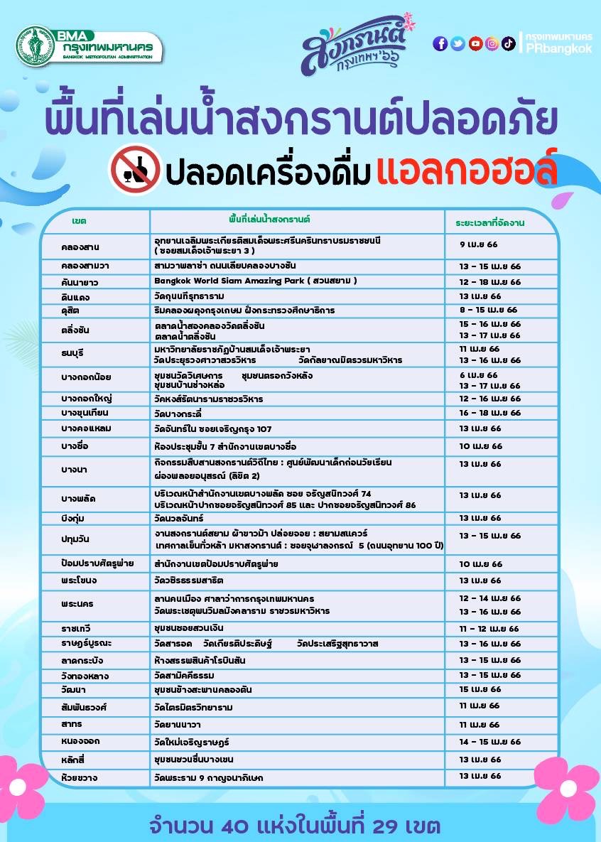 กรุงเทพฯ-นายเอกวรัญญู อัมระปาล โฆษกของกรุงเทพมหานคร เปิดเผยว่า กรุงเทพมหานครมีนโยบาย สงกรานต์ กทม. ปลอดภัย ปลอดเครื่องดื่มแอลกอฮอล์ ภายใต้แนวคิดการรณรงค์ "ขับไม่ดื่ม ดื่มไม่ขับ" โดยให้ทุกสำนักงานเขตและหน่วยงานที่เกี่ยวข้อง เข้มงวด กำกับ ดูแล สงกรานต์ในพื้นที่กรุงเทพมหานครให้มีความปลอดภัย โดยปลอดจากเครื่องดื่มแอลกอฮอล์ ทั้งนี้ ได้เปิดพื้นที่เล่นน้ำสงกรานต์ปลอดภัยปลอดเครื่องดื่มแอลกอลฮอล์ จำนวน 40 แห่ง ในพื้นที่ 29 เขต ตามวันและเวลาที่กำหนด คือ