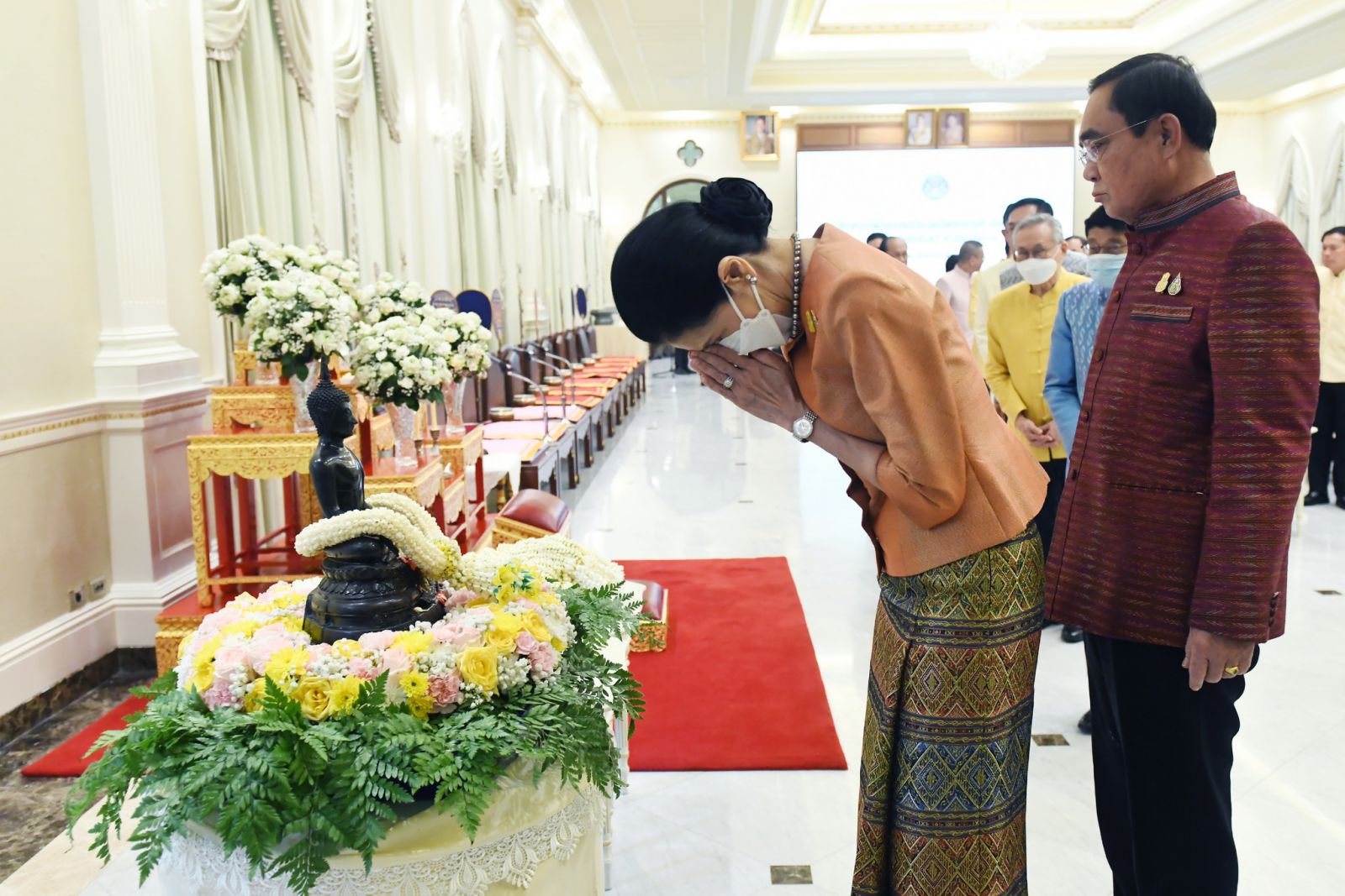 เมื่อนายกรัฐมนตรีและภริยาเดินทางมาถึงบริเวณงาน นายกรัฐมนตรีได้จุดธูปเทียนบูชาพระรัตนตรัย เจ้าหน้าที่อาราธนาศีล พระสงฆ์ให้ศีลและเจริญพระพุทธมนต์ เสร็จแล้วนายกรัฐมนตรีถวายผ้าไตรพระสงฆ์ จำนวน 10 รูป จากนั้นนายกรัฐมนตรีและภริยา พร้อมด้วยคณะรัฐมนตรี ถวายเครื่องไทยธรรม พระสงฆ์อนุโมทนา นายกรัฐมนตรีกรวดน้ำรับพร และสมเด็จพระพุฒาจารย์ วัดไตรมิตรวิทยาราม ประธานสงฆ์ประพรมน้ำพระพุทธมนต์ เป็นอันเสร็จพิธีสงฆ์