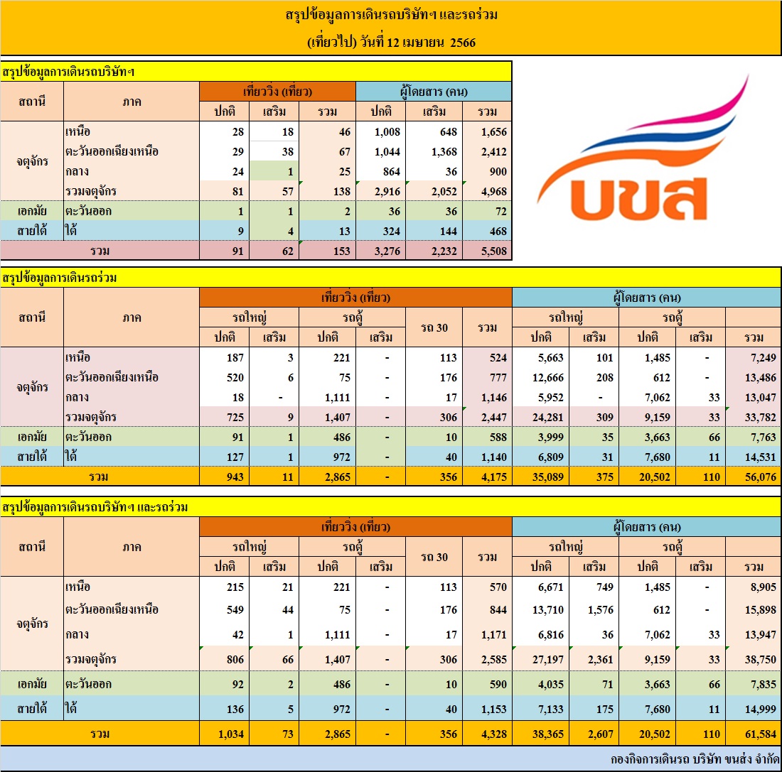 นายสัญลักข์ ปัญวัฒนลิขิต กรรมการผู้จัดการใหญ่ บริษัท ขนส่ง จำกัด (บขส.) กระทรวงคมนาคม เปิดเผยข้อมูลการเดินทางในช่วงเทศกาลสงกรานต์ ปี 2566 ว่า เมื่อวานนี้ ( 12 เมษายน 2566) มีผู้โดยสารเดินทางด้วยรถโดยสารสาธารณะ รวมเที่ยวไป-กลับ จำนวน 105,067 คน ใช้รถโดยสาร (รถ บขส., รถร่วม, รถตู้) จำนวน 8,165 เที่ยว แบ่งเป็นการเดินทางในเที่ยวไป จำนวน 4,328 เที่ยว มีผู้โดยสารใช้บริการ 61,584 คน ส่วนเที่ยวกลับ ใช้รถโดยสาร จำนวน 3,837 เที่ยว รองรับผู้โดยสารใช้บริการ 43,483 คน โดยจำนวนผู้โดยสารเดินทางออกจากกรุงเทพฯ เป็นไปตามที่คาดการณ์ไว้ว่าจะมีผู้โดยสารเดินทางประมาณกว่า 60,000 คน ส่วนการเดินทางในวันนี้ (13 เมษายน 2566) ผู้โดยสารส่วนใหญ่ที่มาใช้บริการที่สถานีขนส่งผู้โดยสารกรุงเทพ (จตุจักร) จะเดินทางในเส้นทางสายสั้น เช่น คลองลาน , สระบุรี , โคราช , ชลบุรี ซึ่งมีรถโดยสารให้บริการเพียงพอ จึงมั่นใจว่าไม่มีผู้โดยสารตกค้าง กรรมการผู้จัดการใหญ่ บขส. กล่าวเพิ่มเติมว่า ในช่วงเทศกาลสงกรานต์ได้เน้นย้ำให้ทุกหน่วยงานที่เกี่ยวข้องจัดสิ่งอำนวยความสะดวก และจัดรถโดยสารให้เพียงพอให้บริการประชาชนที่จะเดินทางในช่วงเวลาดังกล่าว โดยในเที่ยวกลับของเทศกาลสงกรานต์ บขส. ได้กำชับไปยังนายสถานีเดินรถ ให้เตรียมความพร้อมรองรับการเดินทางตั้งแต่วันที่ 16-18 เมษายน 2566 โดย บขส. คาดการณ์ว่าจะมีผู้ใช้บริการเฉลี่ยวันละ 58,000 คน ใช้รถโดยสาร (รถ บขส., รถร่วม, รถตู้) ประมาณ 3,800 เที่ยว นอกจากนี้ได้ประสานขอความร่วมมือองค์การขนส่งมวลชนกรุงเทพ (ขสมก.) ผู้ประกอบการรถแท็กซี่ นำรถโดยสารมาให้บริการ ณ บริเวณชานชาลาขาเข้า สถานีขนส่งผู้โดยสารกรุงเทพ (จตุจักร) หรือหมอชิต 2 และได้ประสาน จส.100 และ สวพ.91 ประชาสัมพันธ์ให้รถแท็กซี่มารับผู้โดยสารในช่วงเวลาดังกล่าว รวมทั้ง บขส. ได้จัดรถจักรยานยนต์รับจ้าง ที่ได้ขอเข้ามาให้บริการในสถานีฯ อย่างถูกระเบียบ ไว้อำนวยความสะดวกผู้โดยสารด้วย อย่างไรก็ดีในช่วงเทศกาลฯ ที่มีผู้เดินทางเป็นจำนวนมาก ขอความร่วมมือผู้โดยสารเพิ่มความระมัดระวังในการเดินทาง เนื่องจากอาจมีกลุ่มมิจฉาชีพเข้ามาฉวยโอกาสหลอกลวงได้ง่าย หากพบปัญหาในการเดินทาง ให้แจ้งเจ้าหน้าที่ หรือตำรวจที่อยู่ในพื้นที่ทันที หรือโทร Call Center 1490 เรียก บขส. ตลอด 24 ชั่วโมง , สายด่วนกรมการขนส่งทางบก 1584