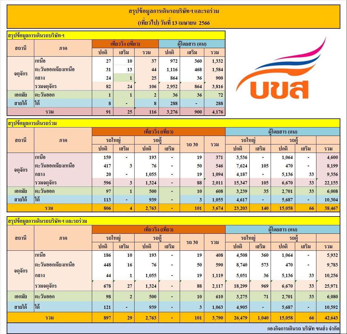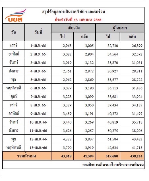 นายสัญลักข์ ปัญวัฒนลิขิต กรรมการผู้จัดการใหญ่ บริษัท ขนส่ง จำกัด (บขส.) กระทรวงคมนาคม เปิดเผยว่า เมื่อวานนี้ (13 เม.ย.66) ตัวเลขผู้โดยสารเดินทางในช่วงเทศกาลสงกรานต์ ยังคงเป็นไปตามคาดการณ์ โดยมีผู้โดยสารเดินทางเที่ยวไป-กลับ จำนวน 84,352 คน ใช้รถโดยสาร (รถ บขส., รถร่วม, รถตู้) จำนวน 7,709 เที่ยว แบ่งเป็นการเดินทางเที่ยวไป จำนวน 3,790 เที่ยว มีผู้โดยสารใช้บริการ 42,634 คน ส่วนเที่ยวกลับ ได้จัดรถโดยสาร จำนวน 3,919 เที่ยว รองรับผู้โดยสารใช้บริการ 41,718 คน โดย บขส.สามารบริหารจัดการเดินรถ ส่งผู้โดยสารทุกคนกลับภูมิลำเนาด้วยความเรียบร้อย ปลอดภัย และไม่มีผู้โดยสารตกค้าง