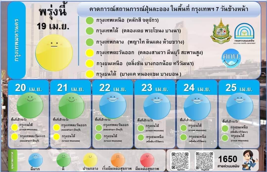 ในช่วงวันที่ 18 - 24 เมษายน 2566 สถานการณ์ในพื้นที่กรุงเทพมหานครและปริมณฑลยังคงมีแนวโน้มที่ดีถึงปานกลาง เนื่องจากสภาพอากาศที่เปิดมากขึ้น เพดานการลอยตัวอากาศที่สูงขึ้น ประกอบกับลมทางใต้ที่กำลังแรงช่วยพัดพาฝุ่นละอองออกจากพื้นที่**‼️‼️