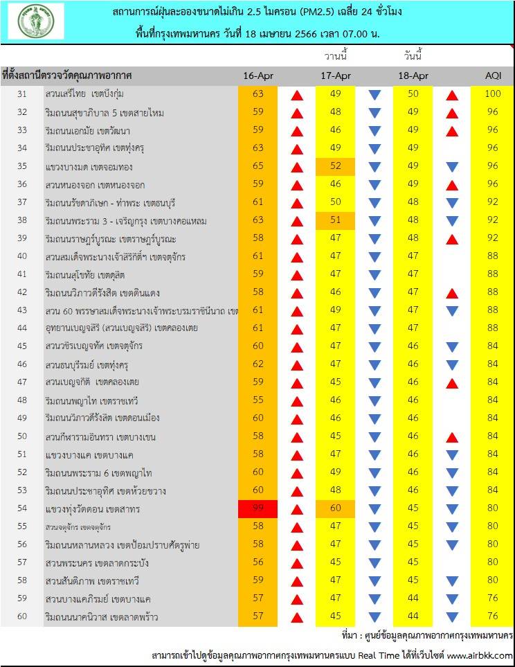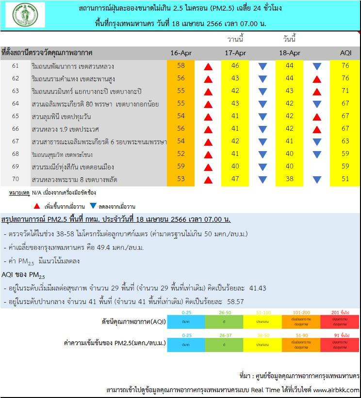 กรุงเทพฯ-ศูนย์ข้อมูลคุณภาพอากาศกรุงเทพมหานครขอสรุปผลการตรวจวัด PM2.5 วันอังคารที่ 18 เมษายน 2566 เวลา 05.00-07.00 น. (3 ชั่วโมงล่าสุด)ตรวจวัดได้ 38-60 มคก./ลบ.ม.ค่าเฉลี่ยของกรุงเทพมหานคร 49.6 มคก./ลบ.ม.ค่า PM2.5 มีแนวโน้มลดลง แต่ยังคงเกินมาตรฐานอยู่ในระดับสีส้มเริ่มมีผลกระทบต่อสุขภาพบางพื้นที่