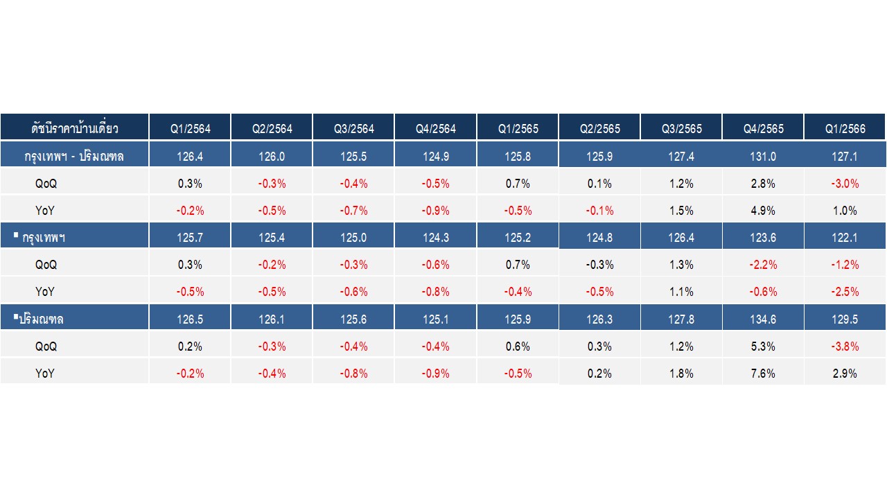 ดัชนีราคาบ้านเดี่ยว ในกรุงเทพฯ และปริมณฑล ไตรมาส 1 ปี 2566 มีค่าดัชนีเท่ากับ 127.1 เพิ่มขึ้นร้อยละ 1.0 เมื่อเทียบกับช่วงเวลาเดียวกันของปีก่อน (YoY) แต่เมื่อเทียบกับไตรมาสก่อนหน้า (QoQ) ลดลงร้อยละ -3.0