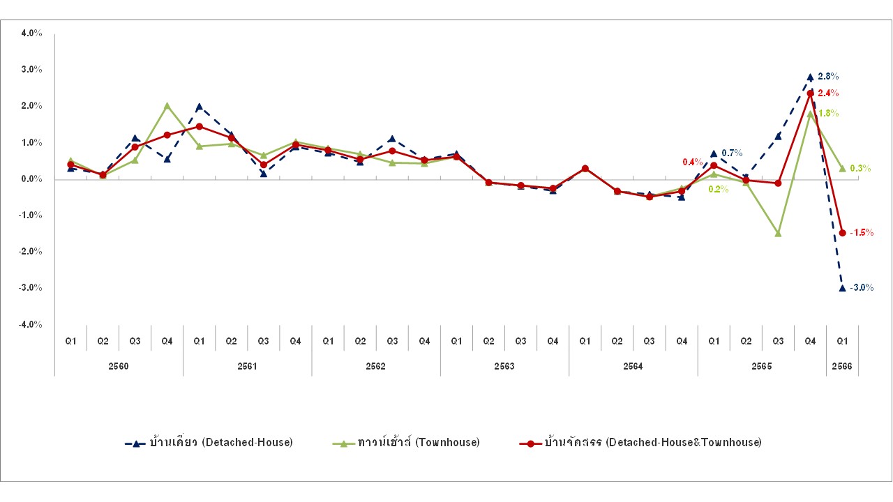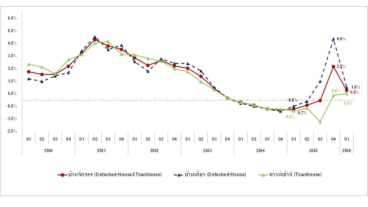 กรุงเทพฯ-รายงานดัชนีราคาที่อยู่อาศัยใหม่ที่อยู่ระหว่างการขาย ไตรมาส 1 ปี 2566 ในพื้นที่กรุงเทพฯ-ปริมณฑล พบว่า ดัชนีราคาบ้านจัดสรรใหม่ที่อยู่ระหว่างการขายเพิ่มขึ้นร้อยละ 0.8 เมื่อเทียบกับช่วงเวลาเดียวกันของปีก่อน (YoY) แต่ลดลงร้อยละ -1.5 เมื่อเทียบกับไตรมาส 4