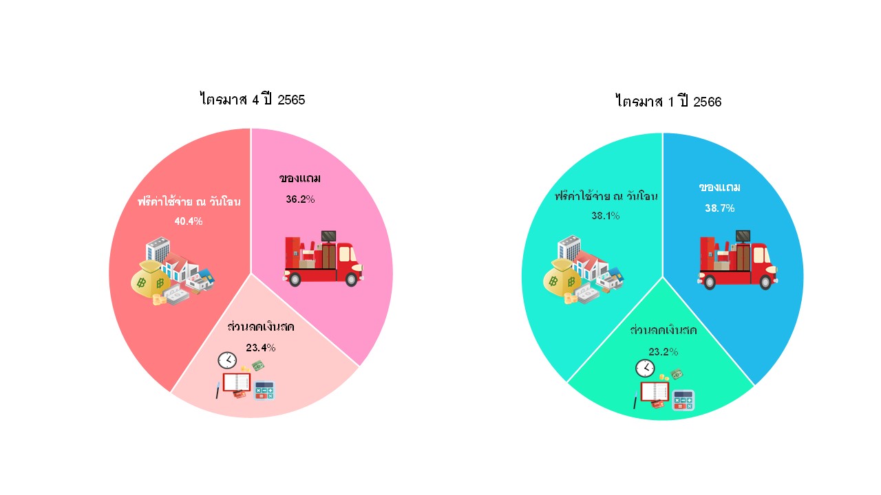 สำหรับรายการส่งเสริมการขายบ้านจัดสรรใหม่ที่อยู่ระหว่างการขายในไตรมาสนี้ พบว่า ส่วนใหญ่ร้อยละ 38.7 เป็นของแถมมากที่สุด เช่น ฟรีแอร์ ปั๊มน้ำ แท็งก์น้ำ มิเตอร์น้ำ มิเตอร์ไฟฟ้า จัดสวน ปูหญ้า แต่เพิ่มขึ้นจากไตรมาสก่อนซึ่งมีสัดส่วนร้อยละ 36.2 รองลงมาร้อยละ 38.1 ให้ฟรีค่าใช้จ่ายในวันโอนฯ ลดลงจากไตรมาสก่อนหน้าซึ่งมีสัดส่วนร้อยละ 40.4 และร้อยละ 23.2 เป็นการให้ส่วนลดเงินสด ลดลงจากไตรมาสก่อนซึ่งมีสัดส่วนร้อยละ 23.4 (ดูแผนภูมิที่ 4)