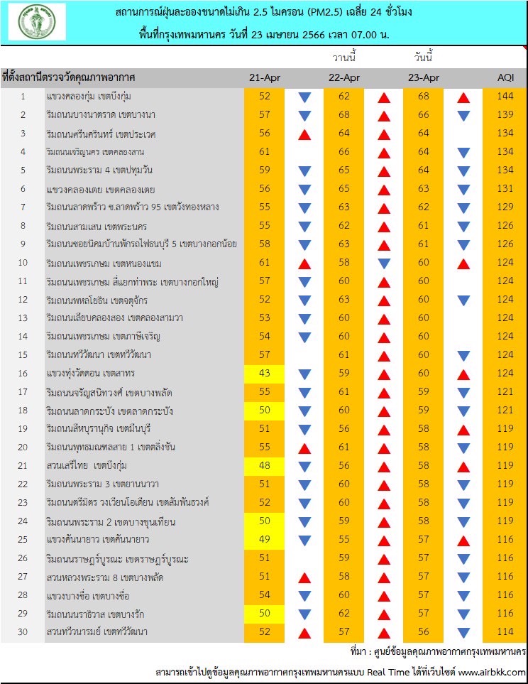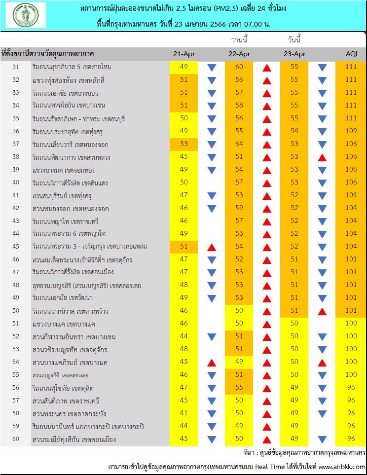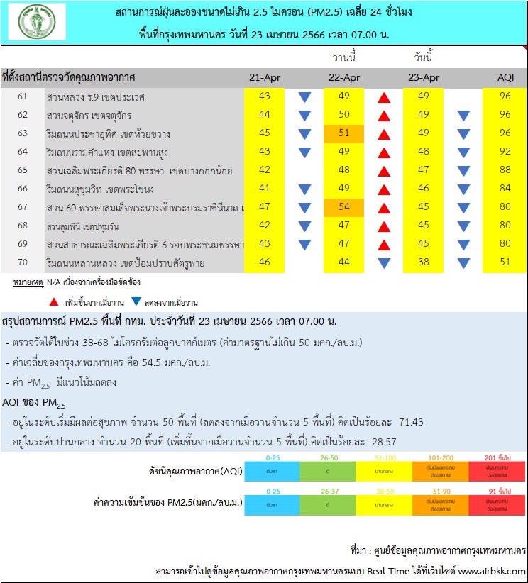 กรุงเทพฯ-ศูนย์ข้อมูลคุณภาพอากาศกรุงเทพมหานครสรุปผลการตรวจวัด PM2.5 วันที่ 23 เมษายน 2566 เวลา 9.00-11.00 น. (3 ชั่วโมงล่าสุด) ตรวจวัดได้ 38-67 มคก./ลบ.ม.ค่าเฉลี่ยของกรุงเทพมหานคร 52.2 มคก./ลบ.ม.ค่า PM2.5 มีแนวโน้มลดลง แต่ยังคงเกินมาตรฐาน