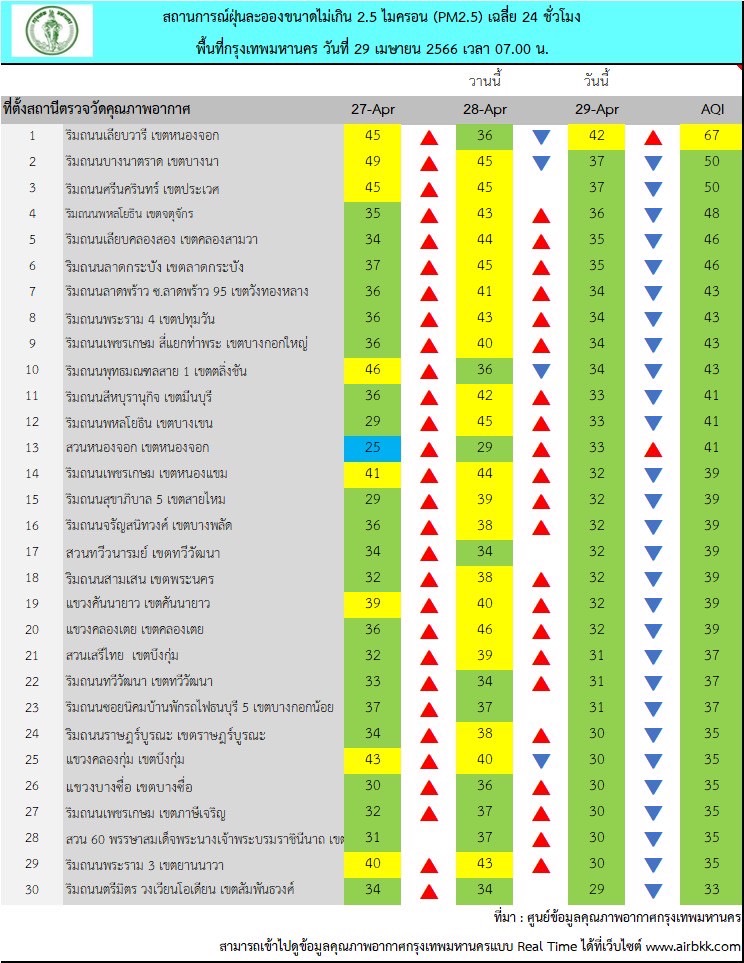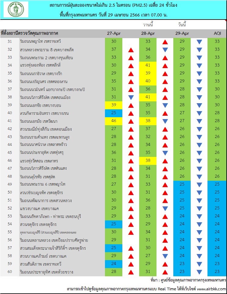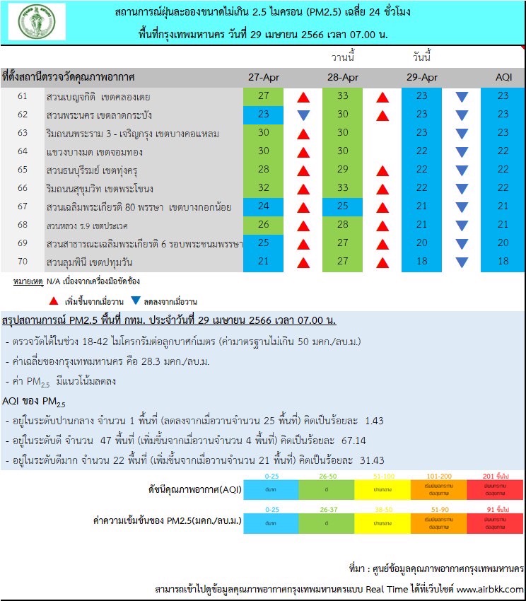กรุงเทพฯ-ศูนย์ข้อมูลคุณภาพอากาศกรุงเทพมหานครสรุปผลการตรวจวัด PM2.5 วันที่ 29 เมษายน 2566 เวลา 05.00-07.00 น. (3 ชั่วโมงล่าสุด) - ตรวจวัดได้ 18-42 มคก./ลบ.ม.- ค่าเฉลี่ยของกรุงเทพมหานคร 28.2 มคก./ลบ.ม.-ค่า PM2.5 มีแนวโน้มเพิ่มขึ้นและอยู่ในเกณฑ์มาตรฐานทุกสถานีที่มีการตรวจวัด