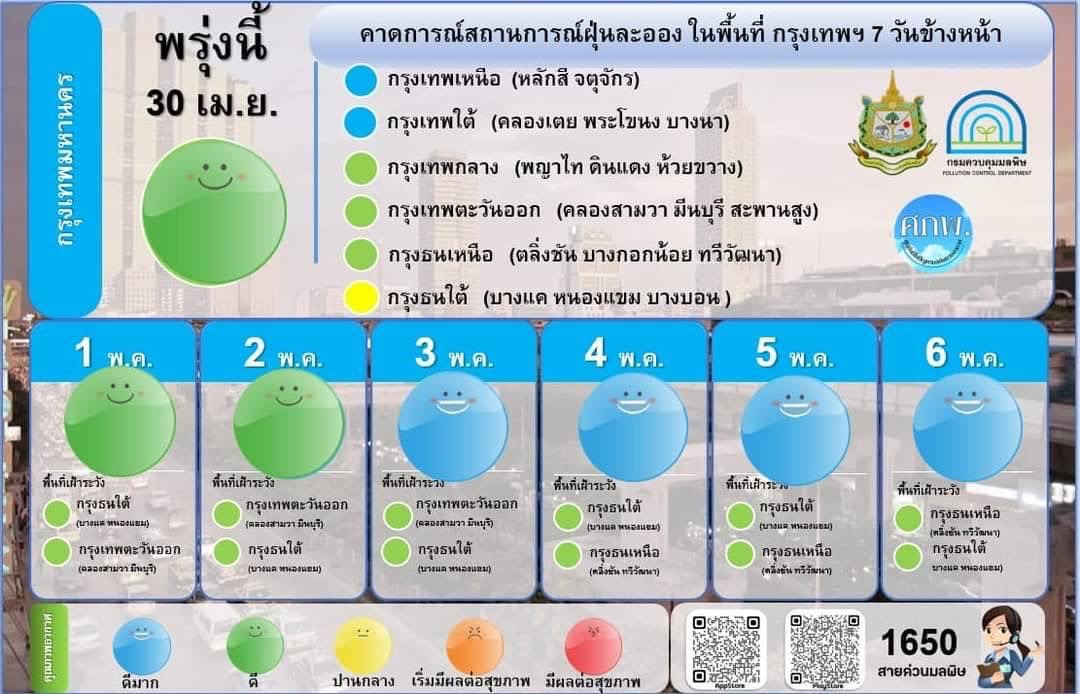 ในช่วงวันที่ 29 เม.ย. - 5 พ.ค. 2566 สถานการณ์ในพื้นที่กรุงเทพมหานครและปริมณฑลยังคงมีแนวโน้มที่ดีถึงปานกลาง โดยตั้งแต่วันที่ 29 เป็นต้นไปสถานการณ์จะมีแนวโน้มที่ดีขึ้นตามลำดับ เนื่องจากสภาพอากาศที่เปิดขึ้น เพดานการลอยตัวอากาศที่สูงขึ้น ประกอบกับลมทางใต้ที่กำลังแรงช่วยพัดพาฝุ่นละอองออกจากพื้นที่