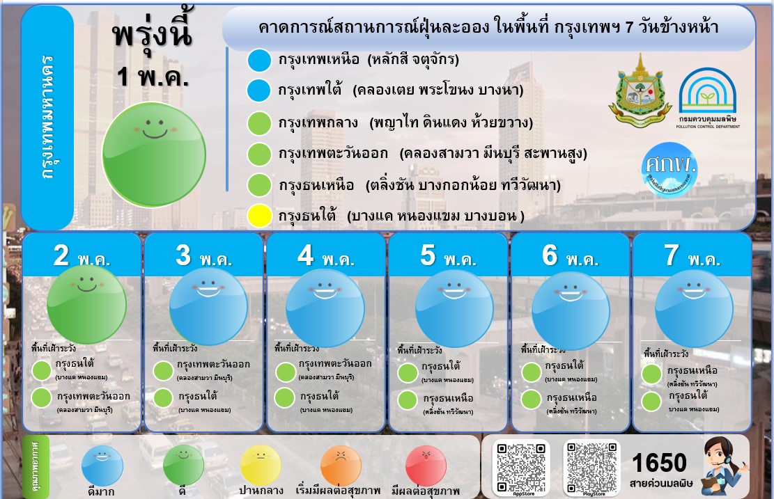 ในช่วงวันที่ 30 เม.ย. - 6 พ.ค. 2566 สถานการณ์ในพื้นที่กรุงเทพมหานครและปริมณฑลยังคงมีแนวโน้มที่ดีถึงปานกลาง โดยตั้งแต่วันที่ 30 เป็นต้นไปสถานการณ์จะมีแนวโน้มที่ดีขึ้นตามลำดับ เนื่องจากสภาพอากาศที่เปิดขึ้น เพดานการลอยตัวอากาศที่สูงขึ้น ประกอบกับลมทางใต้ที่กำลังแรงช่วยพัดพาฝุ่นละอองออกจากพื้นที่