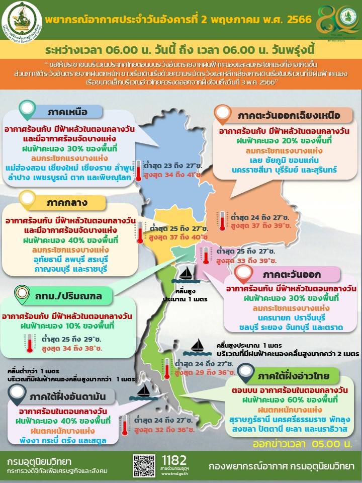 กรุงเทพฯ-รายงานสถานการณ์ วันที่ 2 พฤษภาคม 2566ลักษณะอากาศทั่วไป : พยากรณ์อากาศ 24 ชั่วโมงข้างหน้า บริเวณความกดอากาศสูงหรือมวลอากาศเย็นกำลังปานกลางที่ปกคลุมประเทศไทยตอนบนและทะเลจีนใต้มีกำลังอ่อนลง ประกอบกับลมตะวันออกเฉียงใต้ยังคงพัดปกคลุมประเทศไทยตอนบน ในขณะที่ประเทศไทยตอนบนมีอากาศร้อนถึงร้อนจัด ลักษณะเช่นนี้ทำให้บริเวณดังกล่าวมีฝนฟ้าคะนองและลมกระโชกแรงบางแห่งเกิดขึ้นได้ ขอให้ประชาชนในบริเวณประเทศไทยตอนบนระวังอันตรายจากฝนฟ้าคะนองและลมกระโชกแรงที่อาจจะเกิดขึ้นไว้ด้วย