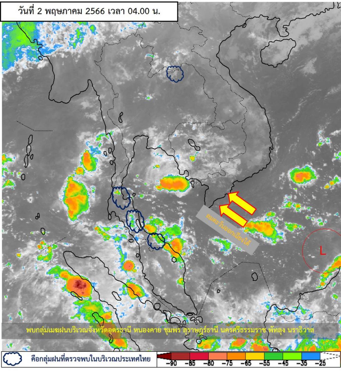 สำหรับลมตะวันออกและลมตะวันออกเฉียงใต้ที่พัดปกคลุมอ่าวไทย ภาคใต้ และทะเลอันดามันเริ่มมีกำลังแรงขึ้น ทำให้ภาคใต้มีฝนเพิ่มขึ้น และมีฝนตกหนักบางแห่ง ขอให้ประชาชนในบริเวณดังกล่าวระวังอันตรายจากฝนตกหนักในระยะนี้ไว้ด้วย ส่วนบริเวณอ่าวไทยทะเลมีคลื่นสูงประมาณ 1 เมตร บริเวณที่มีฝนฟ้าคะนองคลื่นสูงมากกว่า 2 เมตร ขอให้ชาวเรือเดินเรือด้วยความระมัดระวังและหลีกเลี่ยงการเดินเรือในบริเวณที่มีฝนฟ้าคะนอง เรือขนาดเล็กบริเวณอ่าวไทยควรงดออกจากฝั่งจนถึงวันที่ 3 พ.ค. 2566