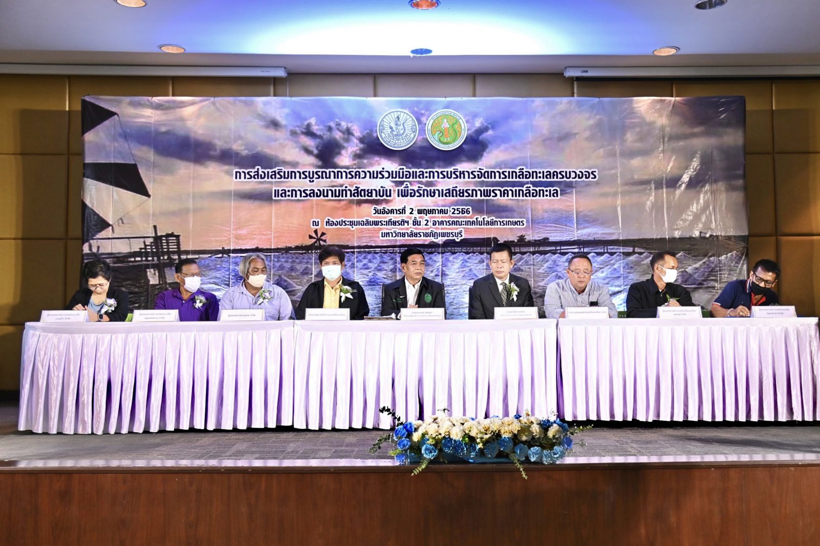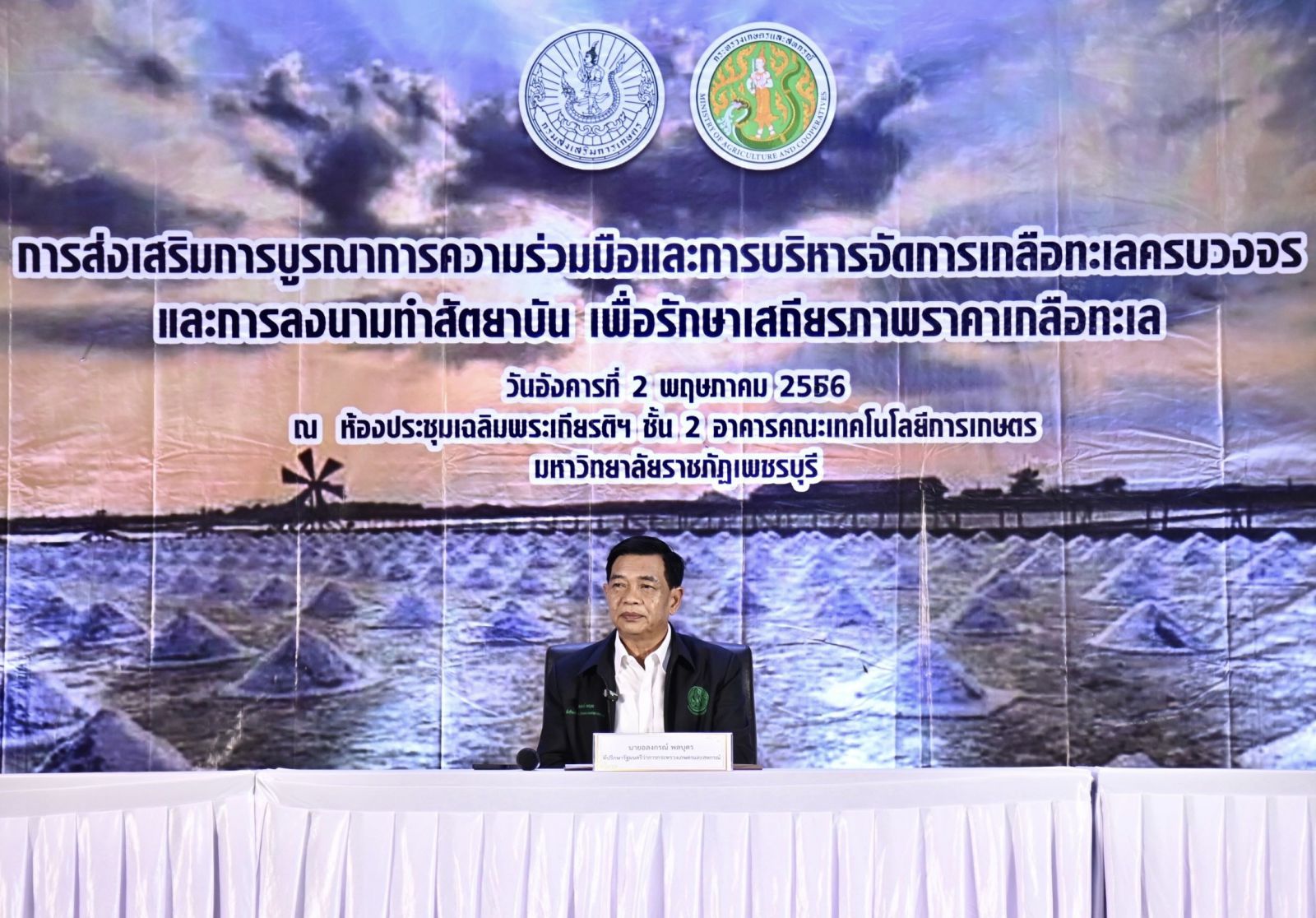 นายอลงกรณ์ พลบุตร ที่ปรึกษารัฐมนตรีว่าการกระทรวงเกษตรและสหกรณ์ ในฐานะประธานคณะกรรมการพัฒนาเกลือทะเลไทย กล่าวภายหลังเป็นประธานพิธีเปิดงานการบูรณาการความร่วมมือและการบริหารจัดการเกลือทะเลครบวงจร และการลงนามลงนามทำสัตยาบันประกันราคาเกลือทะเลขั้นต่ำเพื่อรักษาเสถียรภาพราคาเกลือทะเล พร้อมบรรยายพิเศษ หัวข้อ “ทางรอดเกลือทะเลไทย” ณ ห้องประชุมเฉลิมพระเกียรติฯ ชั้น 2 อาคารคณะเทคโนโลยีการเกษตร มหาวิทยาลัยราชภัฏเพชรบุรี วันนี้(2พ.ค.)ว่า จากสถานการณ์เกลือทะเลไทยในปัจจุบัน เกษตรกรที่ทำนาเกลือทะเลมีจำนวนลดลงอย่างมาก เนื่องจากการทำนาเกลือทะเลต้องอาศัยปัจจัยด้านสภาพภูมิอากาศ ซึ่งเป็นปัจจัยที่ควบคุมไม่ได้ อีกทั้งการทำนาเกลือทะเลสามารถทำได้เพียง 1 ฤดูการผลิตเท่านั้น ซึ่งผลผลิตจะออกสู่ตลาดพร้อมกันในช่วงฤดูแล้ง ทำให้ราคาตกต่ำ แต่หากฤดูการผลิตใดสภาพภูมิอากาศแปรปรวน ส่งผลให้เกิดภัยธรรมชาติ ผลผลิตก็จะออกสู่ตลาดน้อย ทำให้ราคาสูงขึ้น