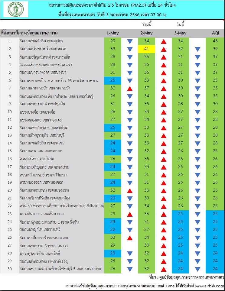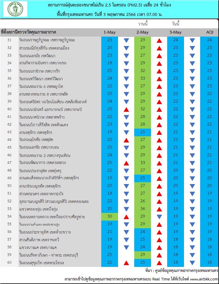 กรุงเทพฯ-ศูนย์ข้อมูลคุณภาพอากาศกรุงเทพมหานครสรุปผลการตรวจวัด PM2.5 วันที่ 3 พฤษภาคม 2566 เวลา 05.00-07.00 น. (3 ชั่วโมงล่าสุด) ตรวจวัดได้ 14-35 มคก./ลบ.ม.ค่าเฉลี่ยของกรุงเทพมหานคร 23.1 มคก./ลบ.ม. ค่า PM2.5 มีแนวโน้มลดลงและอยู่ในเกณฑ์มาตรฐานทุกสถานีที่มีการตรวจวัด