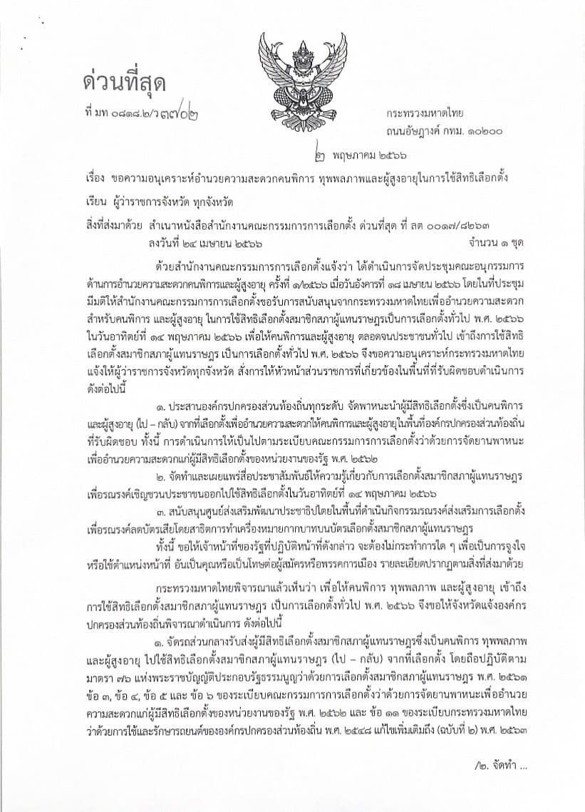 นายสุทธิพงษ์ จุลเจริญ ปลัดกระทรวงมหาดไทย กล่าวว่า จากการประชุมคณะอนุกรรมการด้านการอำนวยความสะดวกคนพิการและผู้สูงอายุ ครั้งที่ 1/2566 เมื่อวันอังคารที่ 18 เมษายน 2566 ที่ประชุมมีมติให้สำนักงานคณะกรรมการการเลือกตั้ง ขอรับการสนับสนุนจากกระทรวงมหาดไทย เพื่ออำนวยความสะดวก สำหรับคนพิการ และผู้สูงอายุในการใช้สิทธิเลือกตั้งสมาชิกสภาผู้แทนราษฎรเป็นการเลือกตั้งทั่วไป พ.ศ. 2566 ในวันอาทิตย์ที่ 14 พฤษภาคม 2566 เพื่อให้คนพิการและผู้สูงอายุ ตลอดจนประชาชนทั่วไป เข้าถึงการใช้สิทธิเลือกตั้งสมาชิกสภาผู้แทนราษฎรเป็นการเลือกตั้งทั่วไป พ.ศ. 2566
