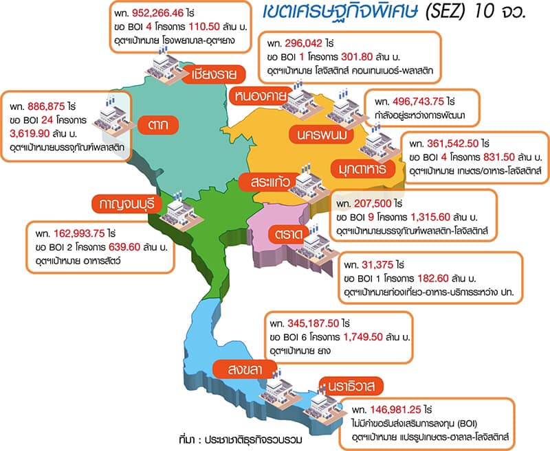 ทั้งนี้ยังมีการพัฒนาพื้นที่ราชพัสดุเพื่อนำร่องการลงทุน ขณะนี้มีเอกชนและการนิคมอุตสาหกรรมแห่งประเทศไทย(กนอ.) ได้เช่าพื้นที่พัฒนาในเขตพัฒนาเศรษฐกิจพิเศษสระแก้ว และสงขลา ส่วนโครงการศูนย์บริการแบบเบ็ดเสร็จด้านแรงงานต่างด้าว สำหรับออกใบอนุญาตการทำงานและเพื่อบริหารจัดการแรงงานต่างด้าวบริเวณชายแดนที่เข้ามาทำงานในลักษณะ ไป-กลับ และตามฤดูกาลนั้น มีแรงงานต่างด้าวที่ได้รับอนุญาตทำงาน จำนวน 2.7 หมื่นคน