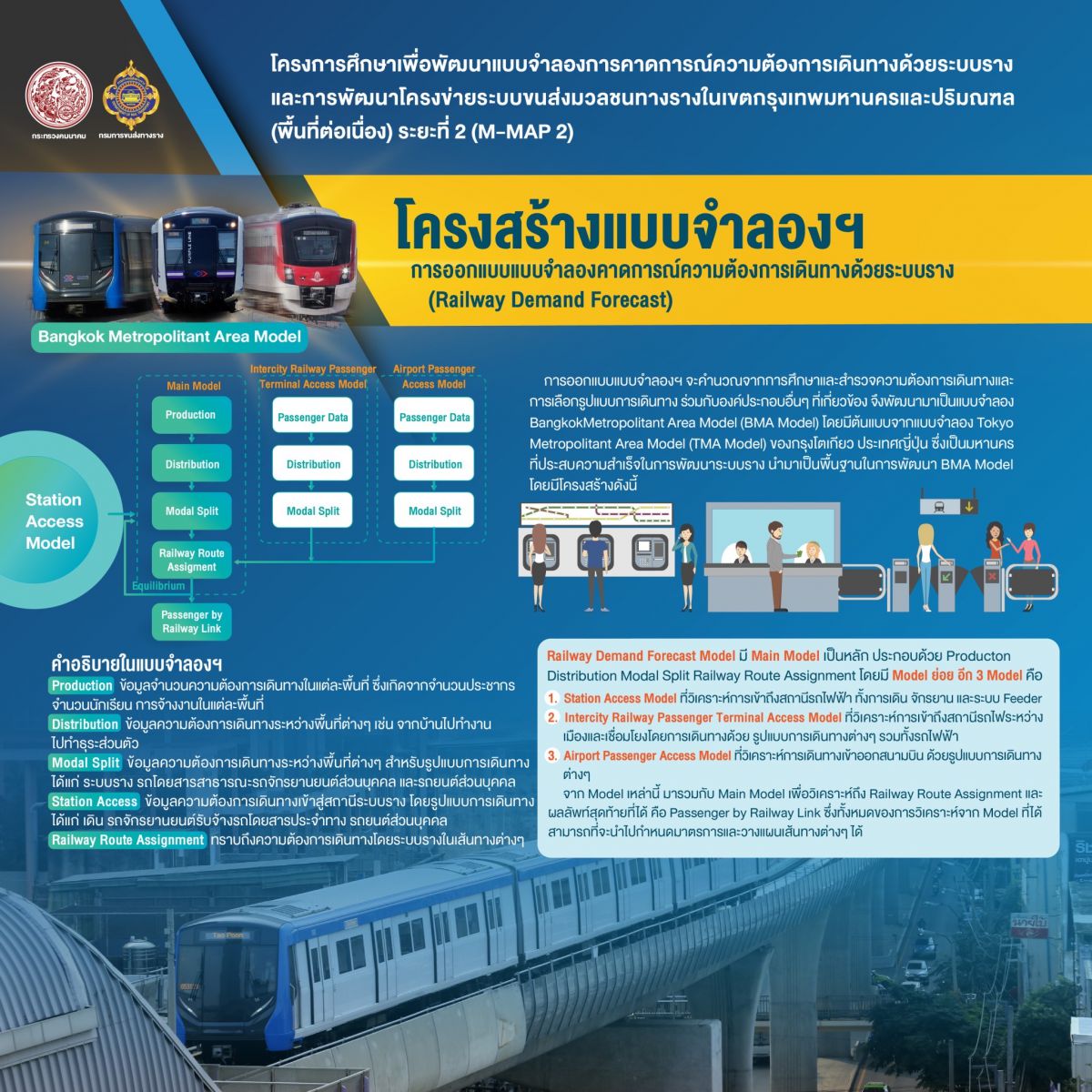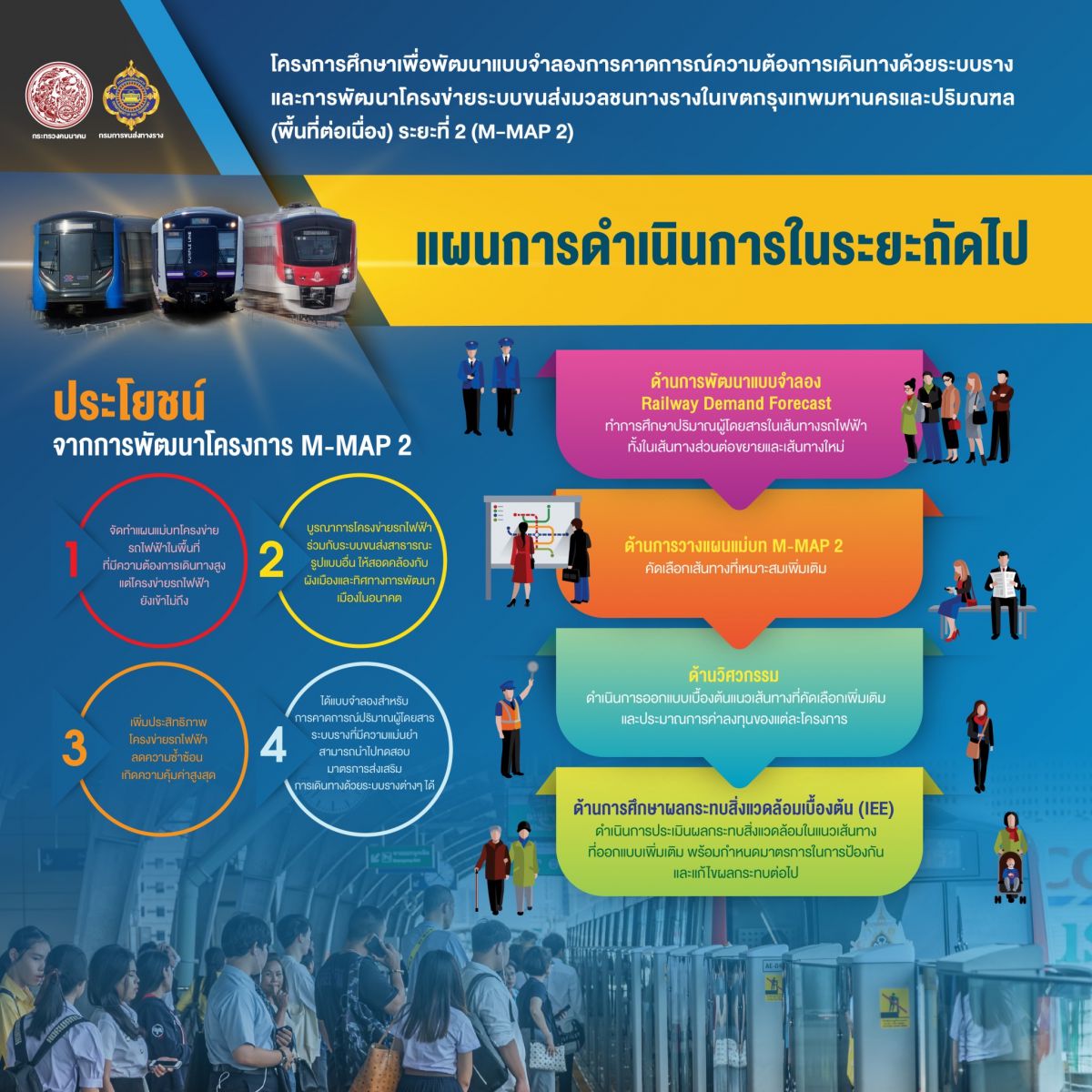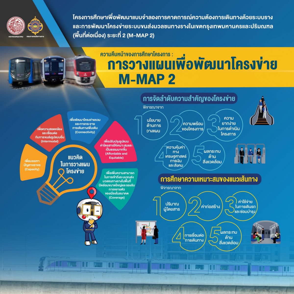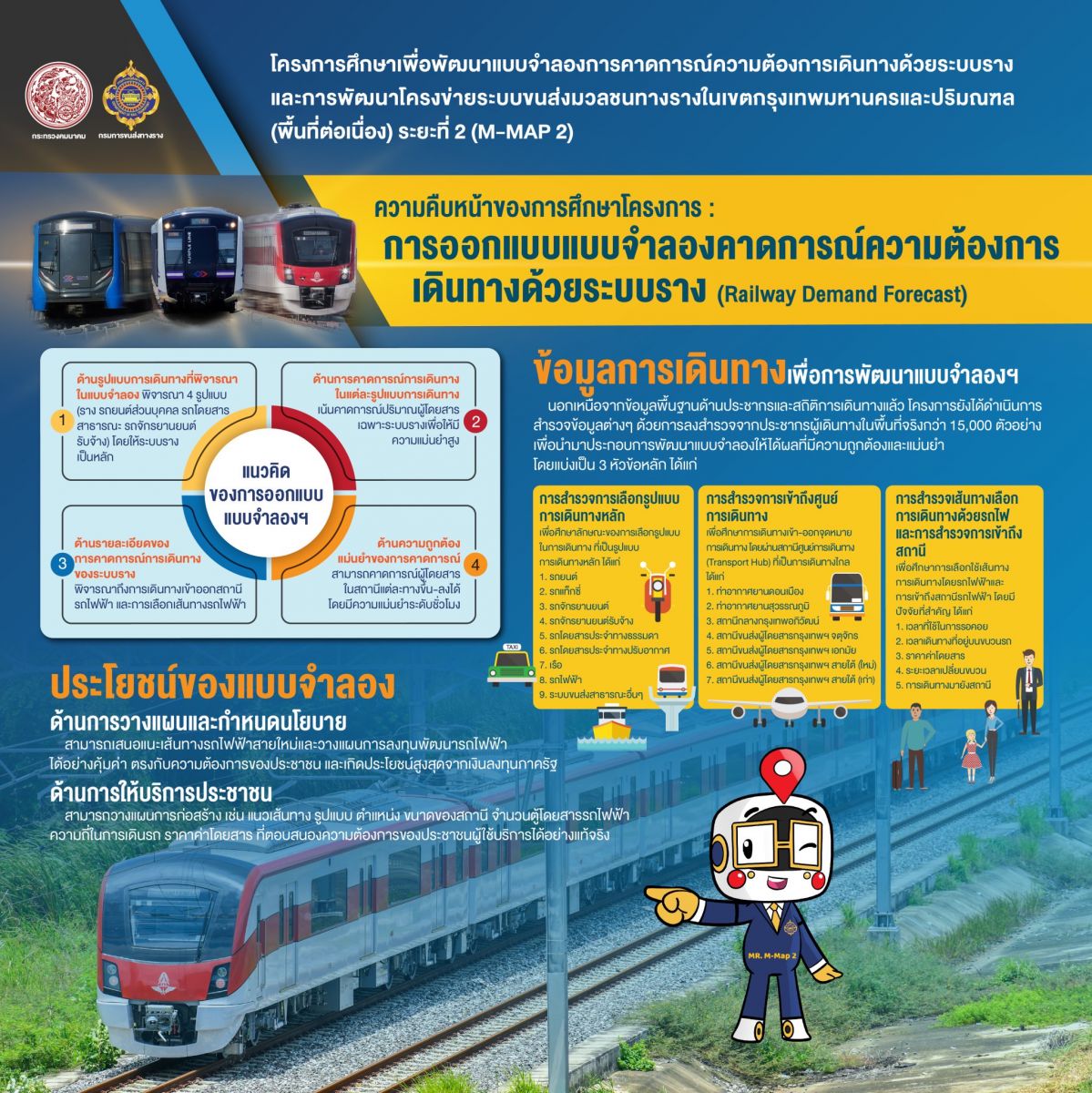 สำหรับโครงการศึกษาเพื่อพัฒนาแบบจำลองการคาดการณ์ความต้องการเดินทางด้วยระบบรางและการพัฒนาโครงข่ายระบบขนส่งมวลชนทางรางในเขตกรุงเทพมหานครและปริมณฑล (พื้นที่ต่อเนื่อง) ระยะที่ 2 นี้ เป็นการศึกษาพัฒนาโครงข่ายรถไฟฟ้าที่มีความครอบคลุมพื้นที่ที่มีความต้องการเดินทางสูงแต่โครงข่ายยังเข้าไม่ถึง เพื่อบรรเทาการจราจรติดขัดในพื้นที่ศูนย์กลางเมือง รวมถึงเพิ่มประสิทธิภาพโครงข่ายระบบขนส่งมวลชนทางรางในภาพรวมของกรุงเทพมหานครและปริมณฑล ให้มีการใช้ประโยชน์อย่างสูงสุด ลดความซ้ำซ้อน เพื่อลดการลงทุนและงบประมาณในโครงข่ายที่ไม่มีความจำเป็นในสภาวการณ์ปัจจุบัน และพัฒนาระบบขนส่งมวลชนทางรางให้สอดคล้องกับทิศทางการพัฒนาและแนวคิดการวางผังเมืองในอนาคต ซึ่งจะช่วยยกระดับคุณภาพชีวิตการเดินทางของประชาชนให้มีความสะดวก รวดเร็ว มากยิ่งขึ้น