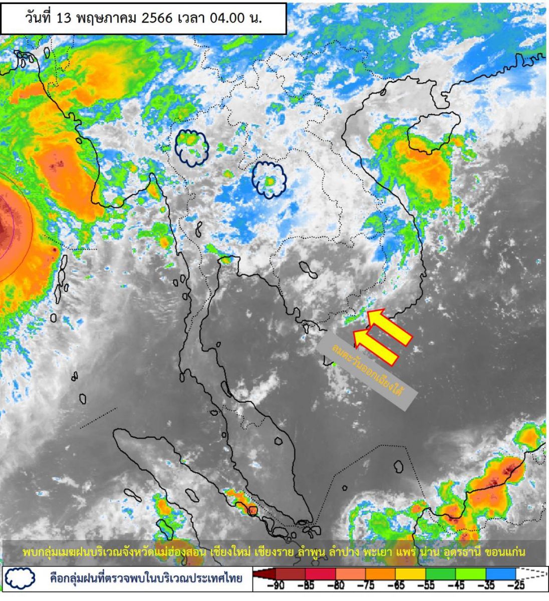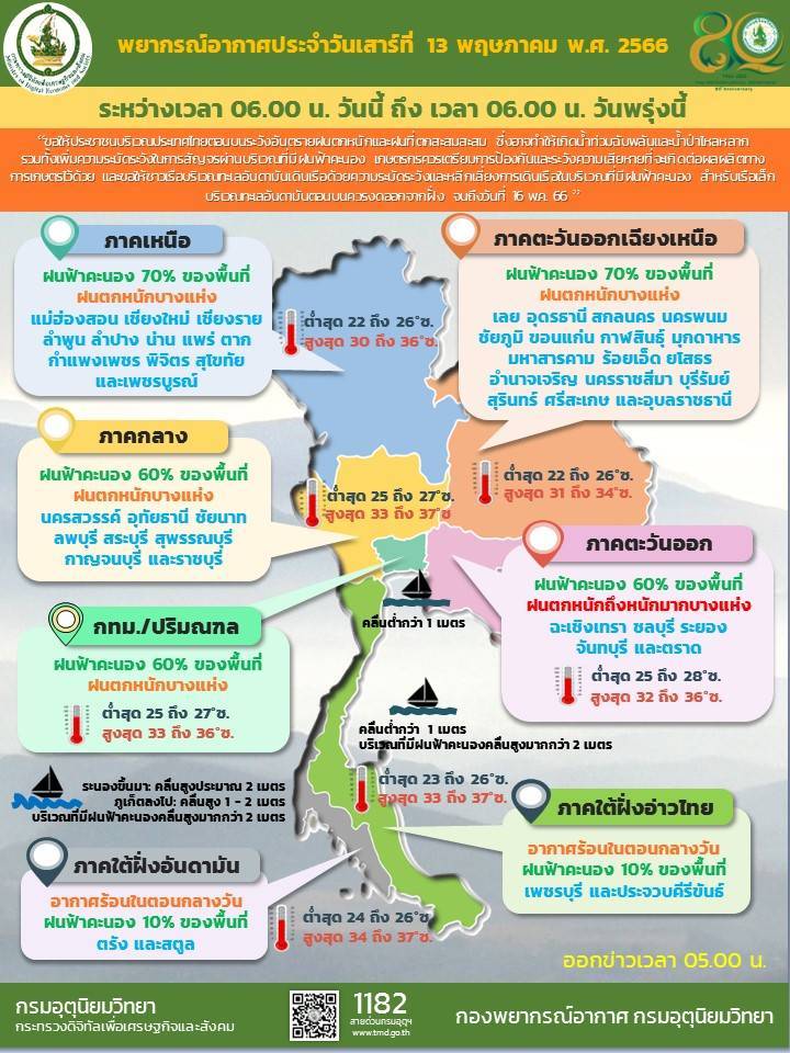 กรุงเทพฯ-รายงานสถานการณ์ วันที่ 13 พฤษภาคม 2566 ลักษณะอากาศทั่วไป : พยากรณ์อากาศ 24 ชั่วโมงข้างหน้า ประเทศไทยตอนบนยังคงมีฝนตกต่อเนื่องกับมีฝนตกหนักบางแห่งในบริเวณภาคเหนือ ภาคตะวันออกเฉียงเหนือ ภาคกลาง กรุงเทพมหานครและปริมณฑล กับมีฝนตกหนักมากบริเวณภาคตะวันออก จึงขอให้ประชาชนระวังอันตรายจากฝนตกหนักและฝนที่ตกสะสม ซึ่งอาจทำให้เกิดน้ำท่วมฉับพลันและน้ำป่าไหลหลาก รวมทั้งเพิ่มความระมัดระวังในการสัญจรผ่านบริเวณที่มีฝนฟ้าคะนอง เกษตรกรควรเตรียมการป้องกันและระวังความเสียหายที่จะเกิดต่อผลผลิตทางการเกษตรไว้ด้วย ทั้งนี้ลมใต้และลมตะวันออกเฉียงใต้ที่พัดปกคลุมบริเวณดังกล่าว