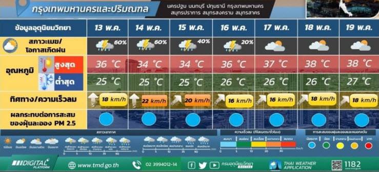 กรุงเทพมหานครและปริมณฑล : มีฝนฟ้าคะนองร้อยละ 60 ของพื้นที่ กับมีฝนตกหนักบางแห่ง อุณหภูมิต่ำสุด 25-27 องศาเซลเซียส อุณหภูมิสูงสุด 33-36 องศาเซลเซียส ลมใต้ ความเร็ว 10-20 กม./ชม.