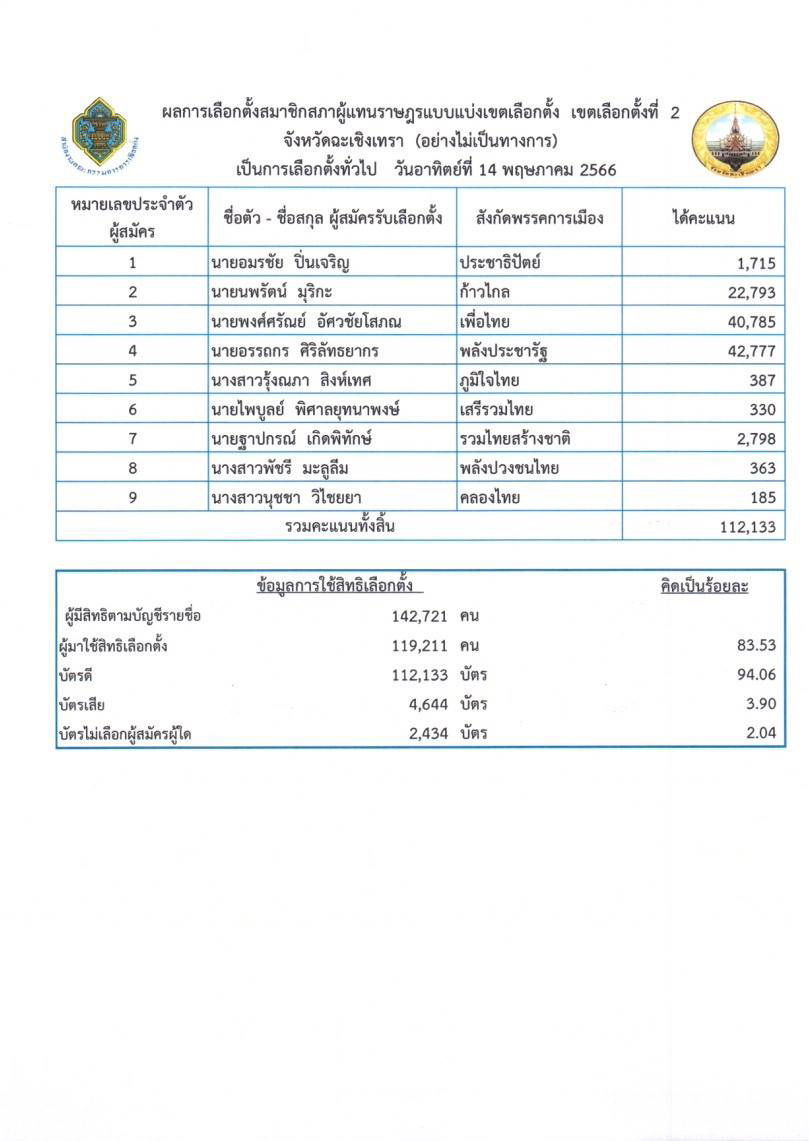 อันดับ 6 น.ส.รุ้งณภา สิงห์เทศ ผู้สมัครหมายเลข 5 พรรคภูมิใจไทย ได้คะแนน 387 คะแนน อันดับ 7 น.ส.พัชรี มะลูลีม ผู้สมัครหมายเลข 8 พรรคพลังปวงชนไทย ได้คะแนน 363 คะแนน อันดับ 8 นายไพบูลย์ พิศาลยุทนาพงษ์ ผู้สมัครหมายเลข 6 พรรคเสรีรวมไทย ได้คะแนน 330 คะแนน อันดับ 9 น.ส.นุชชา วิไชยยา ผู้สมัครหมายเลข 9 พรรคคลองไทยได้คะแนน 185 คะแนน โดยเขตเลือกตั้งที่ 2 นี้อยู่ในเขตพื้นที่ อ.บางน้ำเปรี้ยว บางคล้า ราชสาส์น คลองเขื่อน พนมสารคามบางส่วน เฉพาะ ต.พนมสารคาม และหนองยาว มีผู้มีสิทธิ์เลือกตั้ง 142,721 คนออกมาใช้สิทธิ์ 119,211 คน คิดเป็นร้อยละ 83.53 บัตรดี 112,133 ใบบัตรเสีย 4,644 ใบไม่ประสงค์เลือกผู้ใด 2,434 ใบ