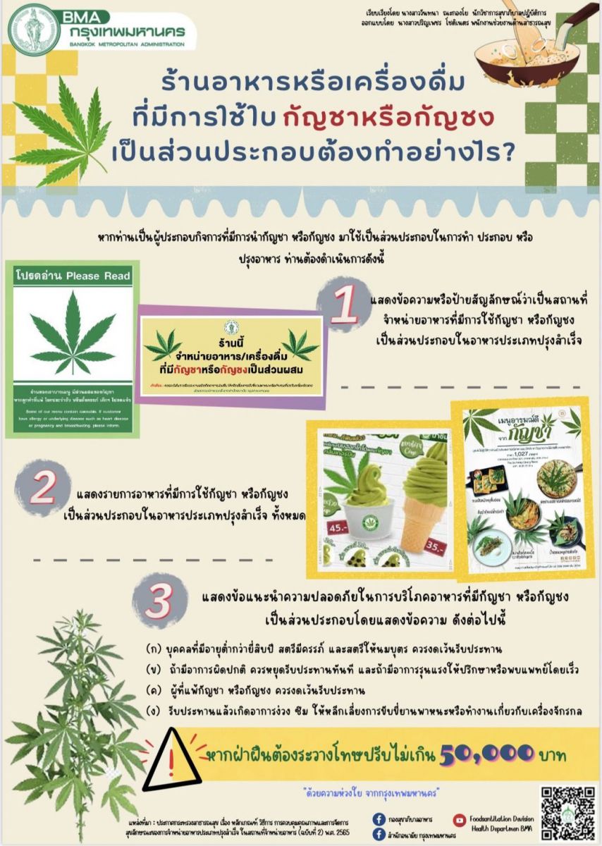 อย่างไรก็ตาม สำนักงานเขตฯ ได้ประชาสัมพันธ์และกำชับให้ร้านอาหารในพื้นที่ที่จำหน่ายอาหารที่มีส่วนประกอบของกัญชา หรือกัญชงเป็นส่วนประกอบอยู่เป็นประจำ โดยให้ร้านปฏิบัติตามประกาศกระทรวงสาธารณสุข เรื่อง หลักเกณฑ์ วิธีการ การควบคุมคุณภาพและการจัดการสุขลักษณะของการจำหน่ายอาหารประเภทปรุงสำเร็จในสถานที่จำหน่ายอาหาร ฉบับที่ 2 พ.ศ.2565 อย่างเคร่งครัด ดังนี้ (1) ต้องแสดงข้อความ หรือป้ายสัญลักษณ์ว่าเป็นสถานที่จำหน่ายอาหารที่มีการใช้กัญชา หรือกัญชงเป็นส่วนประกอบในอาหาร (2) ต้องแสดงรายการอาหารที่มีการใช้กัญชา หรือกัญชงเป็นส่วนประกอบในอาหารประเภทปรุงสำเร็จทั้งหมด และ (3) ต้องแสดงข้อแนะนำความปลอดภัยในการบริโภคอาหารที่มีกัญชา หรือกัญชงเป็นส่วนประกอบ โดยแสดงข้อความคำเตือนที่ว่าบุคคลที่มีอายุต่ำกว่า 20 ปี สตรีมีครรภ์ และสตรีให้นมบุตร ควรงดรับประทาน เป็นต้น