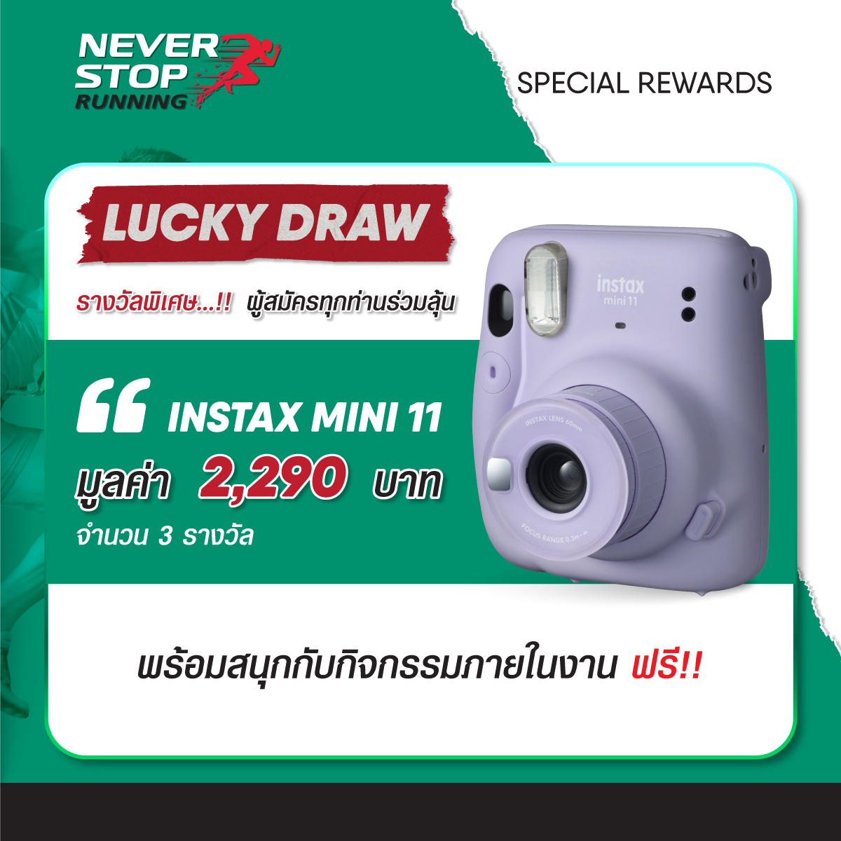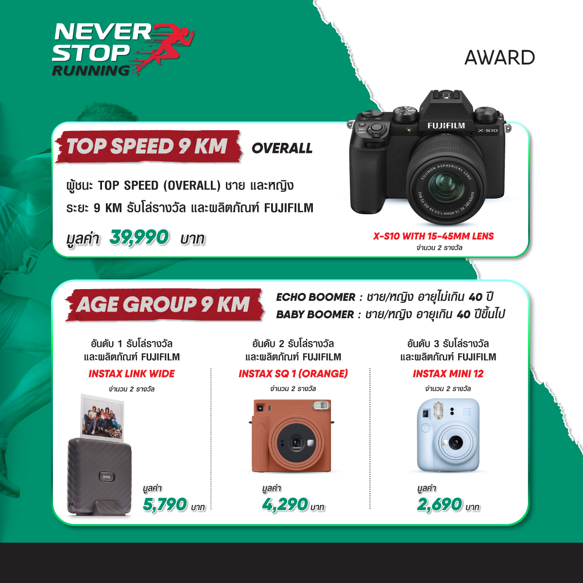 โดยกิจกรรมวิ่งมินิมาราธอนครั้งนี้สามารถเลือกสมัครได้ 3 แบบ 1) มินิมาราธอนระยะทาง 9 กิโลเมตร 2) ฟันรันระยะทาง 5 กิโลเมตร และ 3) เดิน-วิ่งระยะทาง 2 กิโลเมตร พร้อมชิงรางวัลมูลค่ารวมกว่า 112,390 บาท (สำหรับผู้วิ่งประเภทมินิมาราธอนระยะทาง 9 กิโลเมตรเท่านั้น) อาทิ รางวัล Top Speed ชาย/หญิง โดยได้รับถ้วยรางวัลและผลิตภัณฑ์กล้องมิลเลอร์เลส Fujifilm X-S10b นอกจากนี้ รางวัลรุ่นอายุไม่เกิน 40 ปี และรุ่นอายุ 40 ปีขึ้นไป 3 อันดับ จะได้รับถ้วยรางวัลและผลิตภัณฑ์ Fujifilm Instax Link WIDE, Fujifilm Instax SQ1 และ Fujifilm Instax mini 1 ตามลำดับ พร้อมลุ้นรับรางวัล Lucky Draw เป็น Fujifilm Instax mini 11 จำนวน 3 รางวัลอีกด้วย ภายในงานพบกับกิจกรรมมากมายจากฟูจิฟิล์ม และอิ่มอร่อยกับบูธอาหาร-เครื่องดื่มภายในงานอีกเพียบ