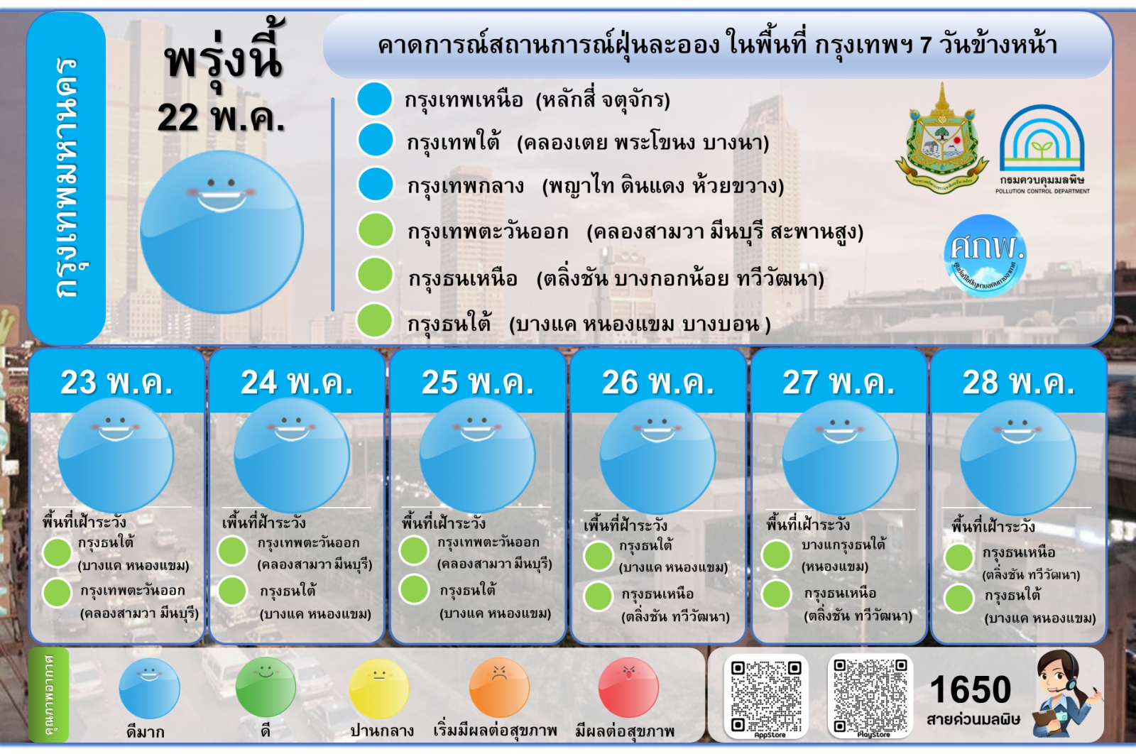 ในช่วงวันที่ 21 - 27 พฤษภาคม 2566 สถานการณ์ในพื้นที่กรุงเทพมหานครและปริมณฑลยังคงมีแนวโน้มที่ดี โดยตั้งแต่วันที่ 21 เป็นต้นไปสถานการณ์จะมีแนวโน้มที่ดีต่อเนื่อง เนื่องจากสภาพอากาศที่เปิดขึ้น เพดานการลอยตัวอากาศที่สูงขึ้น ประกอบกับลมทางใต้ที่กำลังแรงช่วยพัดพาฝุ่นละอองออกจากพื้นที่‼️‼️