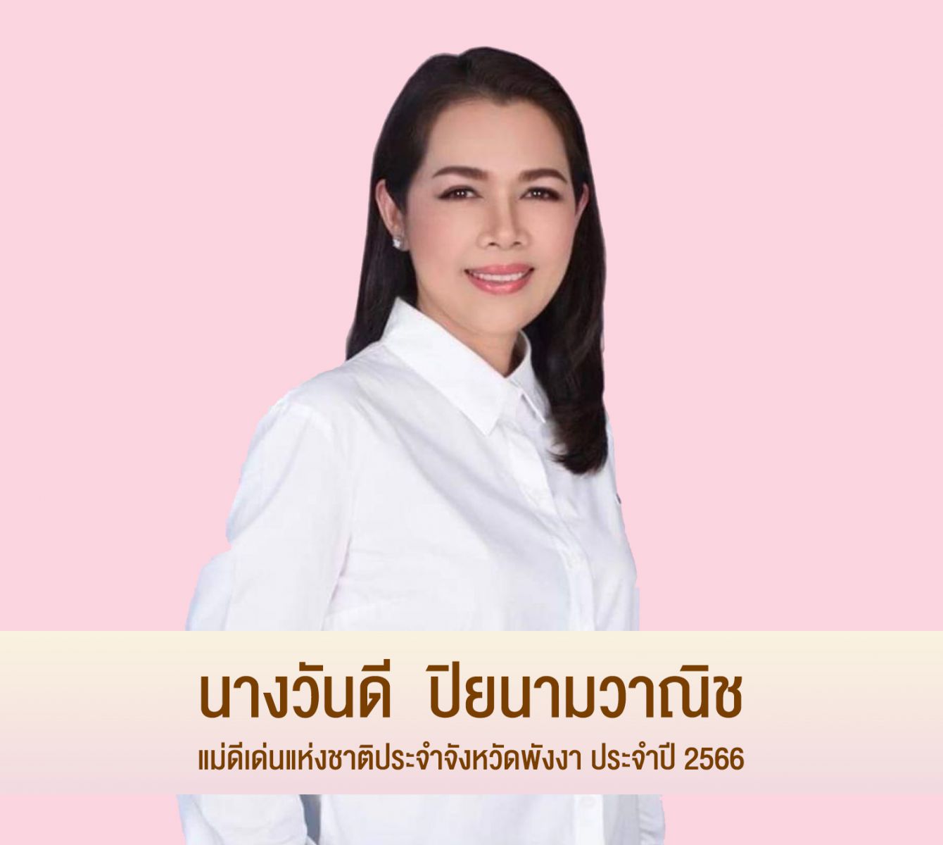 ทั้งนี้ ตามที่สมาคมสภาสังคมสงเคราะห์แห่งประเทศไทย ในพระบรมราชูปถัมภ์ กำหนดจัดงานวันแม่แห่งชาติ ประจำปี 2566 ในวันที่ 12 สิงหาคม 2566 เพื่อเทิดทูนและเผยแพร่พระเกียรติคุณ สมเด็จพระนางเจ้าสิริกิติ์ พระบรมราชินีนาถ พระบรมราชชนนีพันปีหลวง ผู้ทรงเป็นแม่แห่งชาติ เพื่อเผยแพร่พระคุณและบทบาทแม่ ที่มีต่อครอบครัว สังคม และประเทศชาติ เป็นการยกย่องแม่ดีเด่น โดยได้ขอความร่วมมือให้แต่ละจังหวัดพิจารณาคัดเลือกบุคคลที่มีภูมิลำเนาในพื้นที่ สมควรยกย่องเป็นแม่ดีเด่น ประจำปี 2566 ในส่วนของจังหวัดพังงาคณะกรรมการพิจารณาคัดเลือกแม่ดีเด่นแห่งชาติ ประจำปี 2566 จึงได้ร่วมกันพิจารณาคัดเลือกแม่ดีเด่นแห่งชาติ จังหวัดพังงาในครั้งนี้ขึ้น ซึ่งผลการพิจารณาคัดเลือกคณะกรรมการฯ มีมติ เลือก นางวันดี ปิยนามวาณิช อายุ 62 ปี อยู่บ้านเลขที่ 37/9 หมู่ที่ 12 ตำบลกะไหล อำเภอตะกั่วทุ่ง จังหวัดพังงา เป็นผู้เข้ารับการคัดเลือกแม่ดีเด่นแห่งชาติประจำจังหวัดพังงา ประจำปี 2566 ประเภทแม่ผู้บำเพ็ญประโยชน์ต่อสังคม