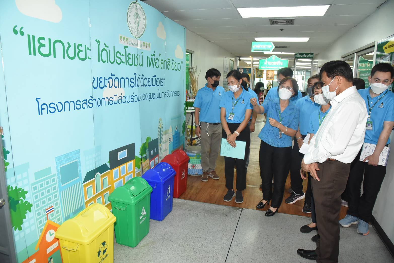 ตรวจเยี่ยมอาคารต้นแบบการคัดแยกขยะ สำนักงานเขตวัฒนา มีข้าราชการและบุคลากร 203 คน วิธีการคัดแยกขยะ โดยจำแนกตามประเภทของขยะ ดังนี้ 1.ขยะรีไซเคิล คัดแยกขยะรีไซเคิลประเภทขวดน้ำพลาสติก โดยนำมาทำกิจกรรมต่าง ๆ ดังนี้ กิจกรรมขวดแลกผัก จัดขึ้น 2 เดือน/ครั้ง ปริมาณขยะ 15 กิโลกรัม/ครั้ง กิจกรรมรับซื้อขยะรีไซเคิล จัดขึ้น 2 เดือน/ครั้ง ปริมาณขยะ 20 กิโลกรัม/ครั้ง กิจกรรมบริจาคขวดเพื่อพี่ไม้กวาด ปริมาณขยะ 7 กิโลกรัม/เดือน ตั้งถังรองรับขยะรีไซเคิล จำนวน 3 ใบ ปริมาณขยะ 3 กิโลกรัม/สัปดาห์ 2.ขยะอินทรีย์ ตั้งวางถังรองรับขยะอินทรีย์ (ถังไม่เทรวม) จำนวน 13 ถัง ฝ่ายรักษาความสะอาดฯ จัดเก็บทุกวัน ในเวลา 14.00 น. จำนวนเฉลี่ย 8 กิโลกรัม/วัน เพื่อนำไปทำปุ๋ยหมักอินทรีย์ที่สวนป่าเอกมัย ปริมาณปุ๋ยหมักอินทรีย์ 100 กิโลกรัม/เดือน นำไปบำรุงรักษาตันไม้ของเขตฯ 3.ขยะอันตราย ตั้งจุด Drop off ที่บริเวณชั้น 8 หน้าห้องฝ่ายรักษาความสะอาดฯ โดยประชาสัมพันธ์แจ้งให้บุคลากรของเขตฯ และประชาชนที่มาติดต่อราชการ นำขยะอันตรายมาใส่ในตู้จุด Drop Off ปริมาณขยะ 35 กิโลกรัม/เดือน เพื่อนำส่งไปกำจัดอย่างถูกวิธีต่อไป 4.ขยะทั่วไป ตั้งวางถังขยะเพื่อรองรับมูลฝอยไว้ตามชั้นต่าง ๆ จำนวน 3 ใบ โดยเจ้าหน้าที่ของอาคารจะจัดเก็บรวมขยะทั่วไป ในเวลา 15.00 น. ปริมาณขยะ 240 ลิตร/วัน และนำไปรวมที่จุดพักขยะของอาคารลิเบอร์ตี้ ชั้น 1 สำหรับปริมาณขยะก่อนคัดแยกและหลังคัดแยก ดังนี้ ขยะทั่วไปก่อนคัดแยก 600 กิโลกรัม/เดือน หลังคัดแยก 240 กิโลกรัม/เดือน ขยะรีไซเคิลก่อนคัดแยก 20 กิโลกรัม/เดือน หลังคัดแยก 42 กิโลกรัม/เดือน ขยะอินทรีย์ก่อนคัดแยก 2 กิโลกรัม/เดือน หลังคัดแยก 8 กิโลกรัม/เดือน ขยะอันตรายก่อนคัดแยก 15 กิโลกรัม/เดือน หลังคัดแยก 35 กิโลกรัม/เดือน ขยะติดเชื้อก่อนคัดแยก 2 กิโลกรัม/เดือน หลังคัดแยก 5 กิโลกรัม/เดือน