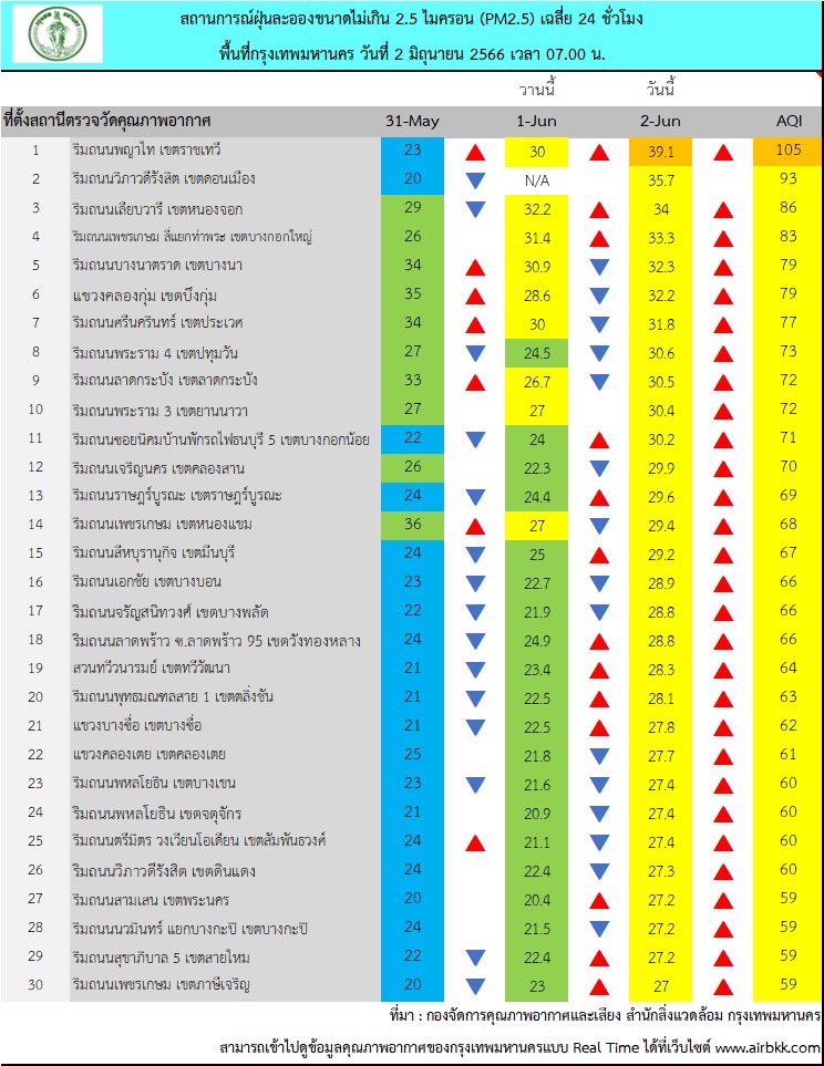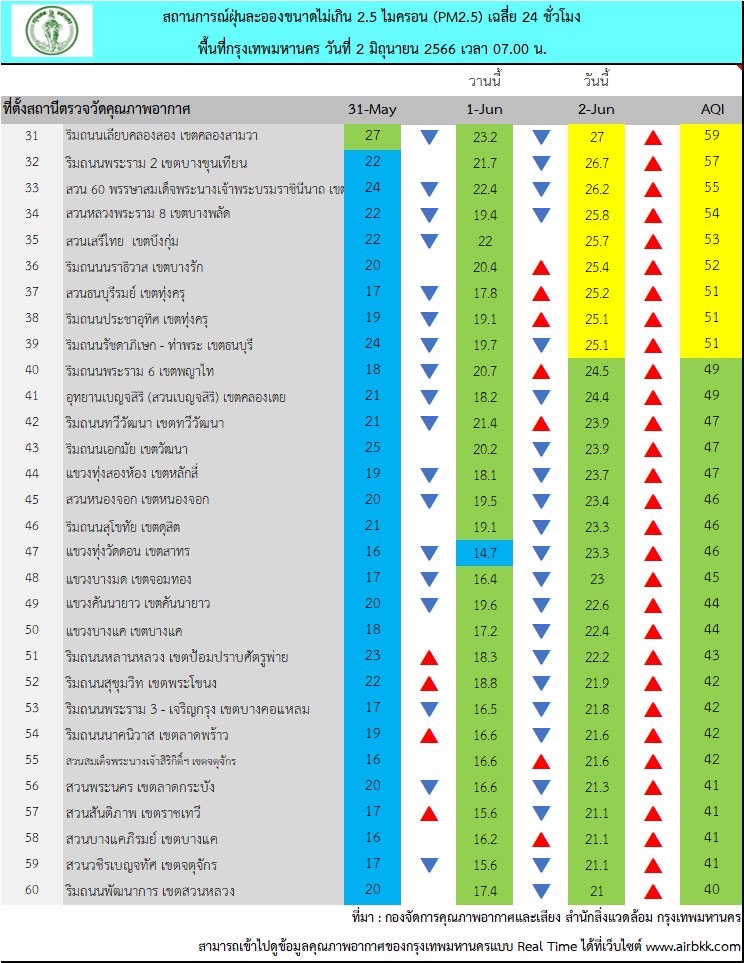 กรุงเทพฯ-ศูนย์ข้อมูลคุณภาพอากาศกรุงเทพมหานครสรุปผลการตรวจวัด PM2.5 วันที่ 2 มิถุนายน 2566 เวลา 05.00-07.00 น. (3 ชั่วโมงล่าสุด) ตรวจวัดได้ 16.7-39.2 มคก./ลบ.ม.ค่าเฉลี่ยของกรุงเทพมหานคร 25.4 มคก./ลบ.ม.ค่า PM2.5 มีแนวโน้มเพิ่มขึ้นเกินมาตรฐานบางพื้นที่