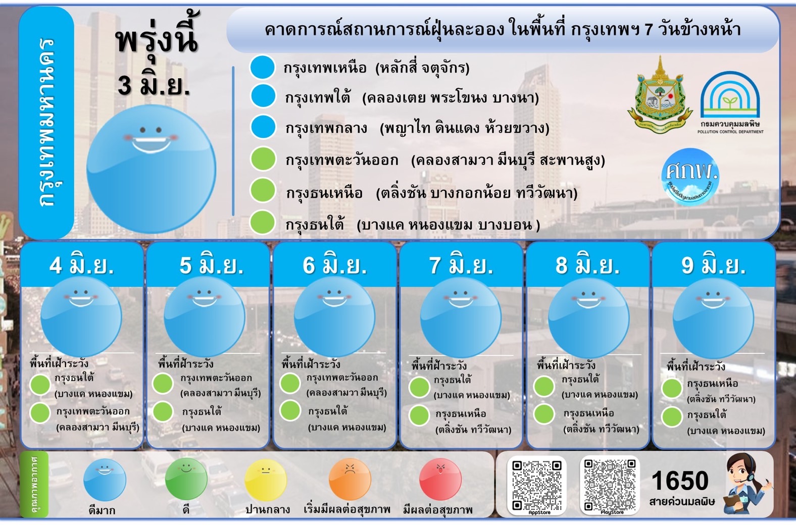 ในช่วงวันที่ 1 - 7 มิ.ย. 2566 สถานการณ์ในพื้นที่กรุงเทพมหานครและปริมณฑลยังคงมีแนวโน้มที่ดี โดยตั้งแต่วันที่ 1 มิ.ย. 2566 เป็นต้นไปสถานการณ์จะมีแนวโน้มที่ดีต่อเนื่อง เนื่องจากสภาพอากาศที่เปิดขึ้น เพดานการลอยตัวอากาศที่สูงขึ้น ประกอบกับลมทางใต้ที่กำลังแรงช่วยพัดพาฝุ่นละอองออกจากพื้น‼️‼️