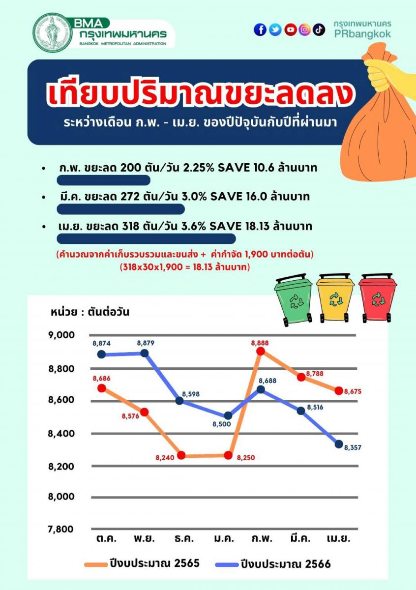 โดยปริมาณขยะเมื่อเทียบ 3 เดือน (กุมภาพันธ์, มีนาคม และเมษายน) ระหว่างปี 2565 และ ปี 2566 พบว่า เดือนกุมภาพันธ์ ปริมาณขยะลดลง 200 ตัน/วัน (2.25%) ทำให้ประหยัดค่าใช้จ่ายในการจัดการขยะไปได้ 10.6 ล้านบาทในเดือนนั้น เดือนมีนาคม ปริมาณขยะลดลง 272 ตัน/วัน (3%) ประหยัดไปได้ 16 ล้านบาท และเดือนเมษายน ปริมาณขยะลดลง 318 ตัน/วัน (3.6%) ประหยัดไปได้ประมาณ 18.13 ล้านบาท ซึ่งรวมทั้งหมด 3 เดือน กทม. สามารถประหยัดไปได้ถึง 44.73 ล้านบาท ซึ่งปริมาณขยะที่ลดลงนี้แสดงให้เห็นว่านโยบายการจัดการขยะที่ต้นทางที่กรุงเทพมหานครดำเนินการมีประสิทธิภาพ ไม่ว่าจะเป็นโครงการไม่เทรวม หรือโครงการ BKK Zero Waste โดยงบประมาณที่ลดลงของการจัดการขยะนี้เท่ากับเงินลงทุนในด้านอื่นๆ ที่เพิ่มขึ้น เช่น สำหรับการศึกษา หรือ ด้านสาธารณสุข