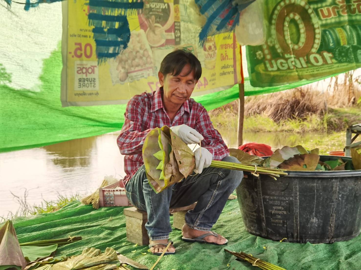 พี่อำนวยเล่าต่อว่า "จากเริ่มทำนาบัวนี้เป็นระยะเวลา 18 ปีแล้ว ส่งลูกเรียนจนจบมหาวิทยาลัยแล้ว แต่ตอนนี้ยังมาช่วยพ่อเก็บบัวทั้ง 2 คน โดยในทุกๆ วัน จะตื่นมาตี 4 กว่าจะออกจากบ้านมาถึงนาบัวก็ประมาณตี 5 พร้อมคนงานเก็บบัว 4 คนเมื่อเริ่มเก็บก็จะมีอุปกรณ์คือกาละมังใหญ่ 1 ใบ มีด 1 เล่ม เก็บใบบัวแก่รองคั่นดอกบัวจนเต็มก็จะพาลอยมาส่งริมตลิ่ง จากนั้นลูกสาว กับคนงานอีก 1 คนก็จะนำดอกบัวมานับกองละ 10 ดอก และพี่อำนวยก็จะนำใบบัวมาห่อและมัด ทำแบบนี้จนถึงเวลาประมาณ 10 โมงครึ่ง ถ้าเป็นวันโกนกับวันพระ หรือวันสำคัญทางศาสนา ก็จะเก็บถึงประมาณเที่ยง เสร็จแล้วจะนำบัวขึ้นรถกระบะไปส่งที่ตลาดไท ที่ จ.ปทุมธานี ทุกวันวันละ 300 - 500 กำ ในราคาส่งกำละ 15 บาท ทางร้านที่ไปส่งก็จะไปขายต่อกำละ 30 บาท โดยมีลูกค้าประจำที่รอรับอยู่ 15 เจ้า ทำให้มีรายได้เข้ามาทุกวัน โดยรายได้ต่อเดือนที่ยังไม่หักค่าใช้จ่ายประมาณ 80,000 บาทต่อเดือน และยังทำให้ชาวบ้านแถวนั้นมีรายได้ในการเก็บบัว โดยจะมีค่าจ้างในการเก็บคือ 100 ดอก 20 บาท ทำครึ่งวันก็จะได้ 300-400 บาทต่อคน ส่งเสร็จรับเงินก็กลับบ้าน มีเวลาอยู่กับครอบครัวได้มากขึ้น"