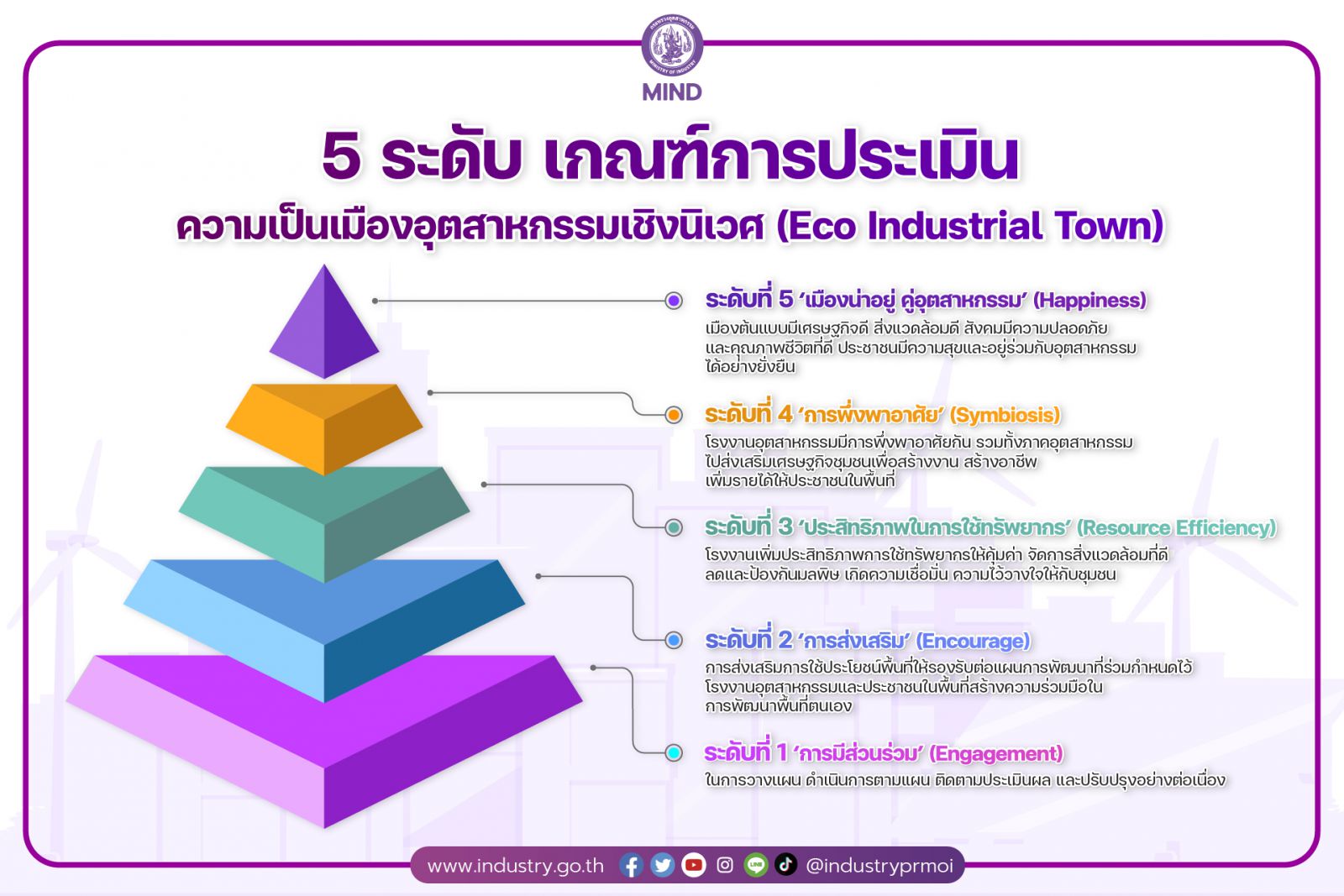 - ระดับที่ 5 ‘เมืองน่าอยู่ คู่อุตสาหกรรม’ (Happiness) เมืองต้นแบบมีเศรษฐกิจดี สิ่งแวดล้อมดี สังคมมีความ ปลอดภัยและคุณภาพชีวิตที่ดี ประชาชนมีความสุขและอยู่ร่วมกับอุตสาหกรรมได้อย่างยั่งยืน