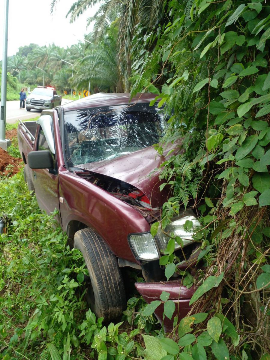 พบเป็นทางโค้ง มี 2 ช่องทางเดินรถเส้นทึบ แบ่งช่องทางเดินรถวิ่งสวนทาง มีใหล่ทางแคบ พบรถยนต์กระบะ บรรทุก ยี่ห้อ อีซูซุ ตอนเดียว สีแดง ทะเบียน บก 6344 กระบี่ เฉี่ยวชนเสาหลักกิโลเมตรข้างทางหักเสียหาย 1 ต้น จากนั้นพุ่งลงข้างทาง ด้านหน้าชนอัดก๊อบปี้กับต้นปาล์มน้ำมัน ทำให้ สภาพด้านหน้ารถพังยับ ส่วนผู้บาดเจ็บ มี 2 ราย จนท.กู้ภัย นำส่งโรงพยาบาลปลายพระยา ทราบชื่อ นายเกรียงศักดิ์ หมื่นไซยชุม อายุ 32 ปี บ้านเลขที่ 81/1 ม.5 ต.ปกาศัย อ.เหนือคลอง จ.กระบี่ ได้รับบาดเจ็บสาหัส ส่งต่อ รพ.กระบี่ เสียชีวิตในเวลาต่อมา และ น.ส.เรวดี คุระเอียด อายุ 30 ปี บ้านเลขที่ 55 ม.2 ต.เหนือคลอง อ.เหนือคคลอง จ.กระบี่ นั่งข้างคนขับได้รับบาดเจ็บบริเวณใบหน้า แขนซ้าย ขวา เป็นแผลฉีกขาด ถลอก เจ้าหน้าที่ปฐมพยาบาล ก่อนนำส่ง รพ.ปลายพระยา รักษาอาการบาดเจ็บ เบื้องต้นอาการปลอดภัย
