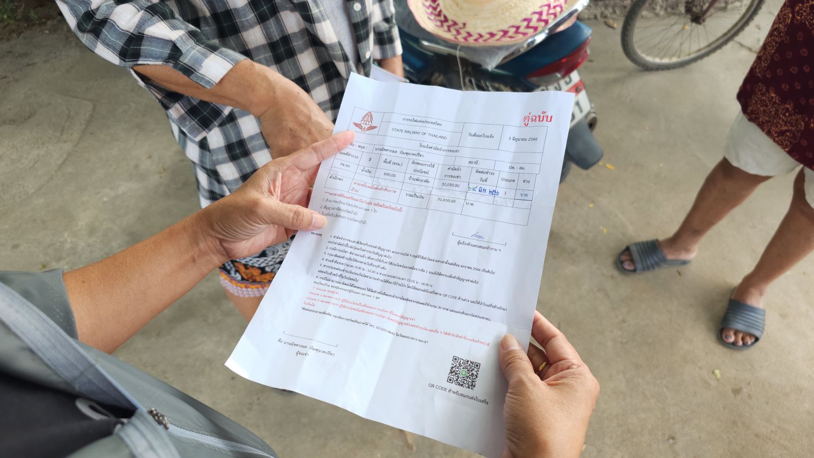 กระทั่งเมื่อประมาณต้นปี 66 ที่ผ่านมา ได้มีเจ้าหน้าที่ของการรถไฟลงพื้นที่มาสำรวจ และทำการรังวัดที่ดินของตนและชาวบ้านคนอื่นๆ พร้อมฉีดพ่นสีสเปรย์ตัวเลขแสดงสัญลักษณ์ ต่อมาได้มีใบแจ้งค่ามัดจำการขอเช่าส่งถึงชาวบ้าน โดยของตนมีการเรียกเก็บค่ามัดจำการเช่าที่จำนวน 2 แปลง คือพื้นที่เกษตรขนาด 194 ตารางเมตร และพื้นที่บ้านพักอาศัย ขนาด 65.50 ตารางเมตร รวมค่าเช่าที่ต้องจ่ายกว่า 5,000 บาท ขณะที่ตนเป็นผู้พิการมาแล้ว 18 ปี ปัจจุบันมีรายได้หลักจากเงินสงเคราะห์เบี้ยยังชีพผู้สูงอายุ และคนพิการรวมกันเพียง 1,400 บาทต่อเดือน