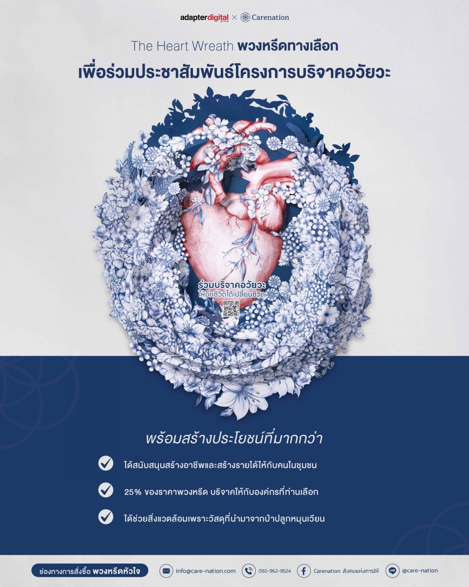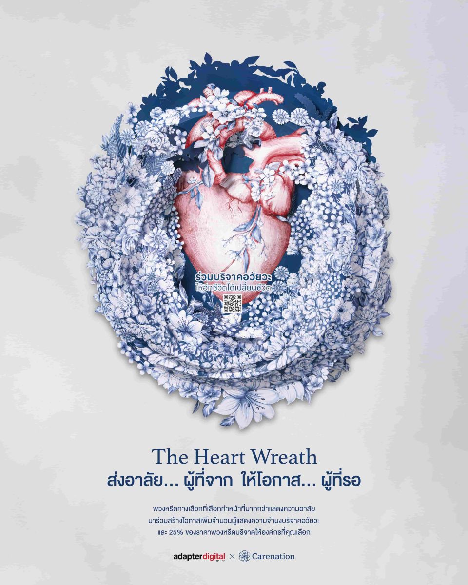 กรุงเทพฯ-Carenation และ Adapter Digital Group บริษัทเอเจนซี่โฆษณา ร่วมแจ้งเกิดโปรเจกต์เพื่อสังคมไอเดียใหม่ The Heart Wreath หรือ พวงหรีดหัวใจ พวงหรีดแห่งการทำดี ช่วยทำให้คนรับรู้ถึงโครงการบริจาคอวัยวะมากขึ้น และ 25% ของราคาพวงหรีดได้บริจาคให้กับองค์กรการกุศล และยังสร้างอาชีพเสริมกระจายรายได้เข้าชุมชน