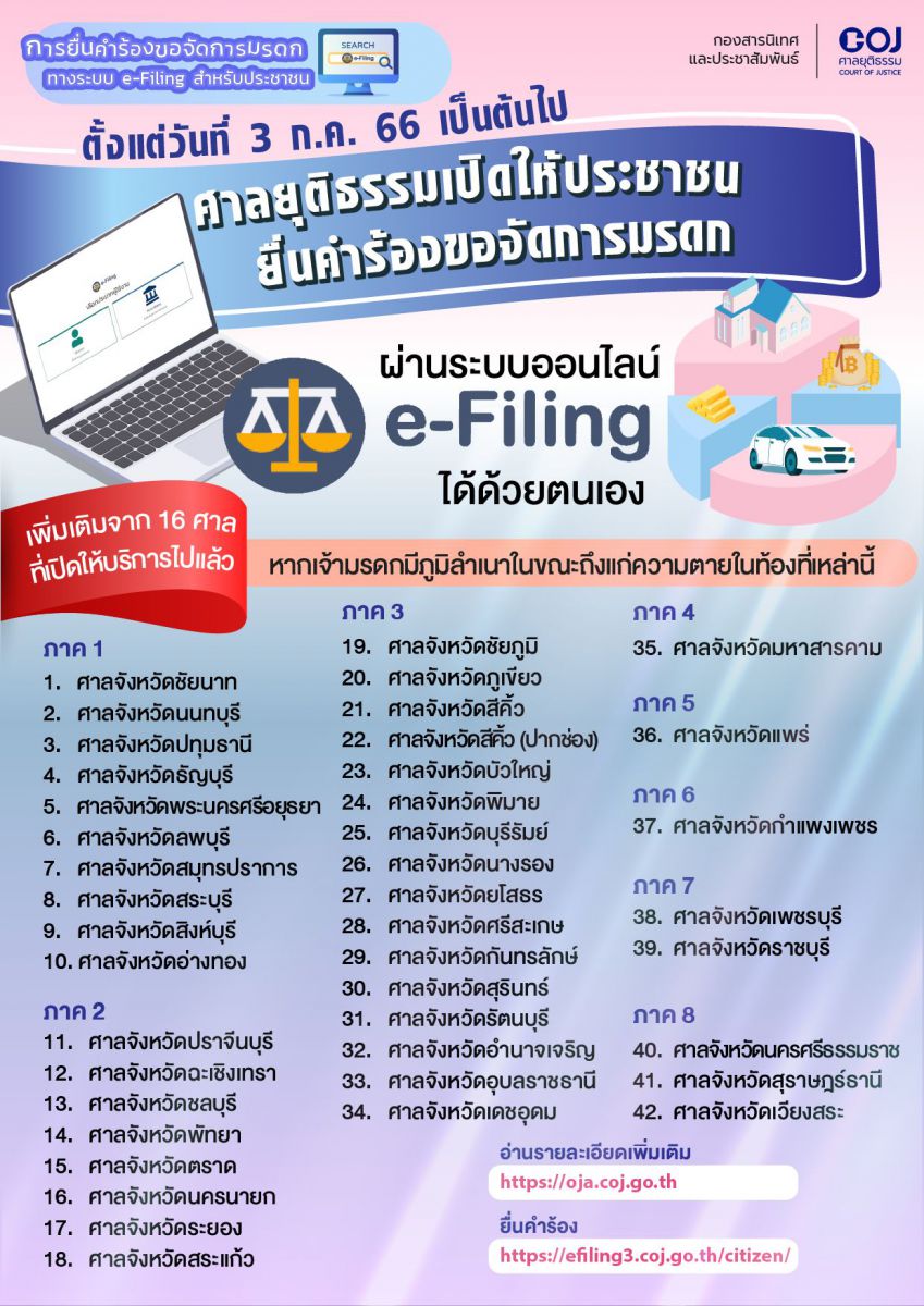 ล่าสุด ตั้งแต่วันที่ 3 ก.ค. 66 เป็นต้นไป ได้ขยายเขตอำนาจศาลที่ประชาชนสามารถยื่นคำร้องขอจัดการมรดผ่าน e-Filing เพิ่มเติมอีก 42 ศาลจังหวัด ในพื้นที่ภาค 1-8 โดย ภาค 1 ประกอบด้วย ศาลจังหวัดชัยนาท, ศาลจังหวัดนนทบุรี,ศาลจังหวัดปทุมธานี, ศาลจังหวัดธัญบุรี, ศาลจังหวัดพระนครศรีอยุธยา, ศาลจังหวัดลพบุรี, ศาลจังหวัดสมุทรปราการ,ศาลจังหวัดสระบุรี, ศาลจังหวัดสิงห์บุรี, ศาลจังหวัดอ่างทอง ภาค 2 ประกอบด้วย ศาลจังหวัดปราจีนบุรี, ศาลจังหวัดฉะเชิงเทรา, ศาลจังหวัดชลบุรี, ศาลจังหวัดพัทยา,ศาลจังหวัดตราด, ศาลจังหวัดนครนายก, ศาลจังหวัดระยอง, ศาลจังหวัดสระแก้ว