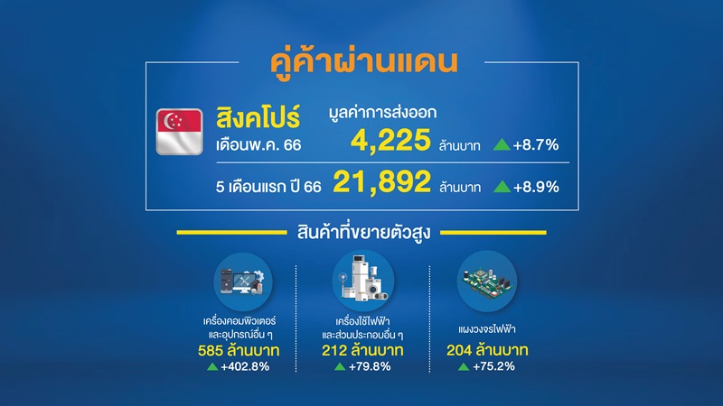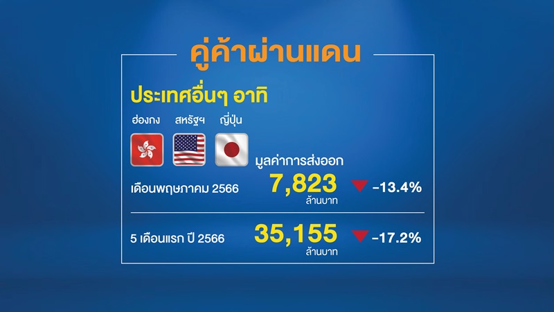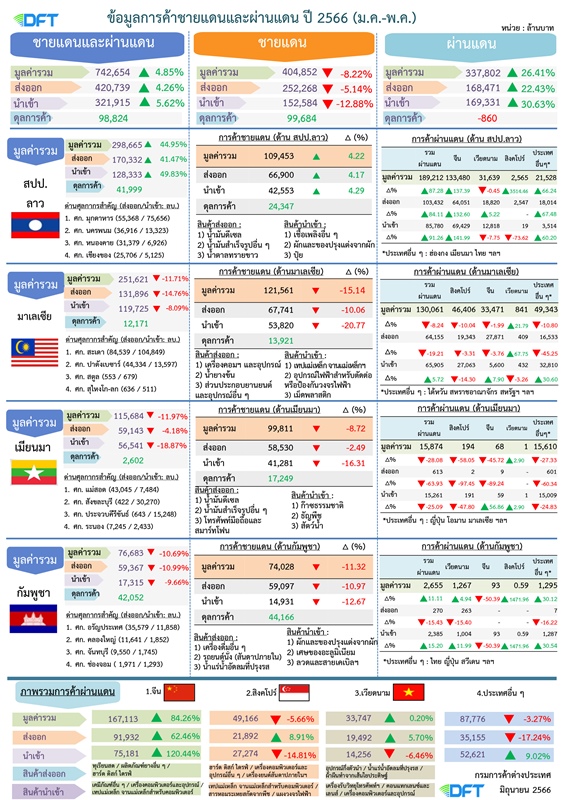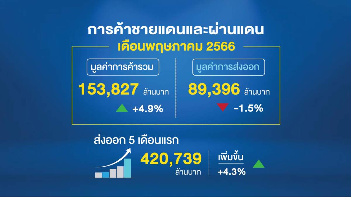 โฆษกประจำสำนักนายกรัฐมนตรี กล่าวว่า กระทรวงกระทรวงพาณิชย์ รายงานตัวเลขการค้าชายแดนและผ่านแดนไทย เดือนพฤษภาคม 2566 มีมูลค่ารวม 153,827 ล้านบาท เพิ่มขึ้น 4.9% เมื่อเทียบกับปี 2565 และไทยได้ดุลการค้า รวม 24,966 ล้านบาท โดยการค้าชายแดนกับ 4 ประเทศ ได้แก่ มาเลเซีย สปป.ลาว เมียนมา และกัมพูชา มีมูลค่าการค้ารวม 82,418 ล้านบาท ซึ่งไทยได้ดุลการค้าประมาณ 26,001 ล้านบาท ขณะที่การค้าผ่านแดนไปจีน เวียดนาม สิงคโปร์ และประเทศอื่น ๆ มีมูลค่าการค้ารวม 71,409 ล้านบาท เพิ่มขึ้น 22.9% เมื่อเทียบกับปี 2565 โดยในภาพรวม 5 เดือน (มกราคม – พฤษภาคม) ปี 2566 ไทยส่งออกผ่านการค้าชายแดนและผ่านแดน รวม 420,739 ล้านบาท เพิ่มขึ้น 4.3% เมื่อเทียบกับปี 2565 ทั้งนี้ สถานการณ์การค้าชายแดนและการค้าผ่านแดนไทย ช่วงครึ่งปีหลังคาดว่าจะปรับตัวดีขึ้นอีก โดยกระทรวงพาณิชย์ได้เร่งผลักดันการเปิดด่านและจุดผ่านแดนเพิ่มเติมอย่างต่อเนื่อง ซึ่งจะมีส่วนช่วยอำนวยความสะดวกและสนับสนุนการค้าชายแดนและผ่านแดนไทยให้ขยายตัวมากขึ้น