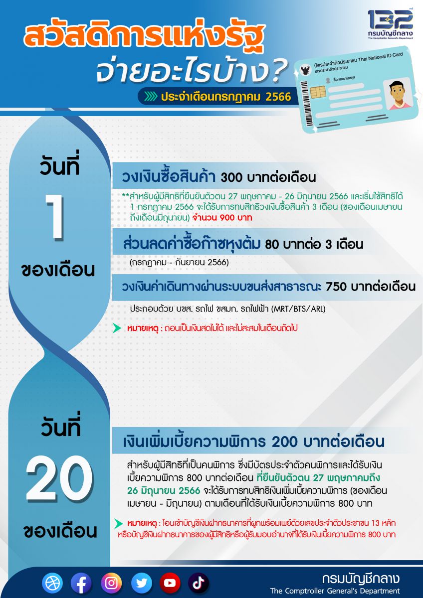 กรุงเทพฯ-กรมบัญชีกลางอัปเดตสวัสดิการแห่งรัฐ เดือนกรกฎาคม 2566 จ่ายอะไรบ้างโครงการลงทะเบียนเพื่อสวัสดิการแห่งรัฐ ปี 2565 ผู้มีสิทธิจะสามารถใช้สิทธิผ่านบัตรประจำตัวประชาชนแบบสมาร์ทการ์ดในเดือนกรกฎาคม 2566