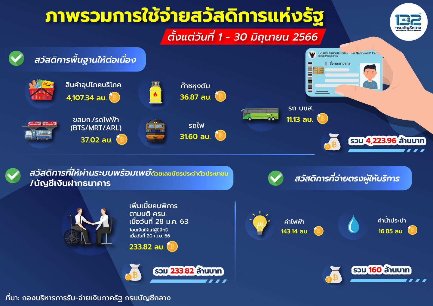 สำหรับเดือนมิถุนายน 2566 กรมบัญชีกลางขอรายงานผลการจ่ายเงินสวัสดิการแห่งรัฐ ข้อมูลตั้งแต่วันที่ 1- 30 มิถุนายน 2566 ดังนี้